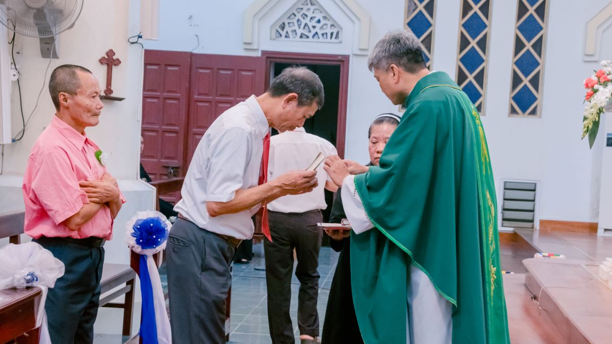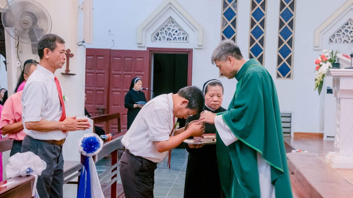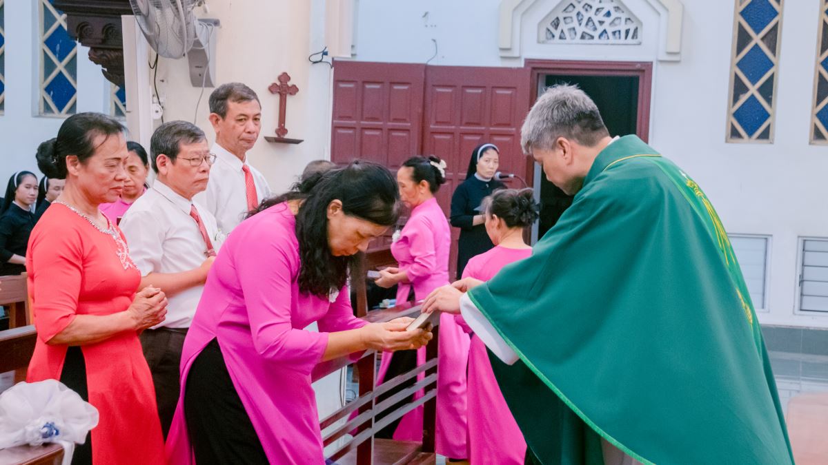 Kế đến, cha chủ sự long trọng trao Sách Tân Ước cho từng hội viên cùng với lời nguyện: “Các con hãy nhận lấy sách Phúc Âm để Lời Chúa trở thành ngọn đèn soi bước các con đi và để các con chia sẻ Tin Mừng Cứu Độ cho mọi người.” Trong tâm tình sốt sắng, các hội viên đón nhận Sách Phúc Âm như khuôn vàng thước ngọc, làm chuẩn mực cho đời sống đức tin, để mỗi ngày biết noi gương Chúa Kitô trên đường thánh giá. Ước mong rằng, qua hồng ân này, các thành viên luôn ý thức sống gắn bó mật thiết với Chúa, chiêm ngắm Đức Giêsu Chịu Đóng Đinh và bước sát dấu chân Ngài hơn, trung thành trong linh đạo Mến Thánh Giá.