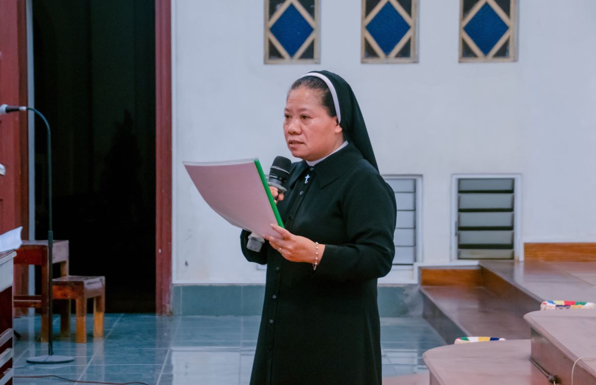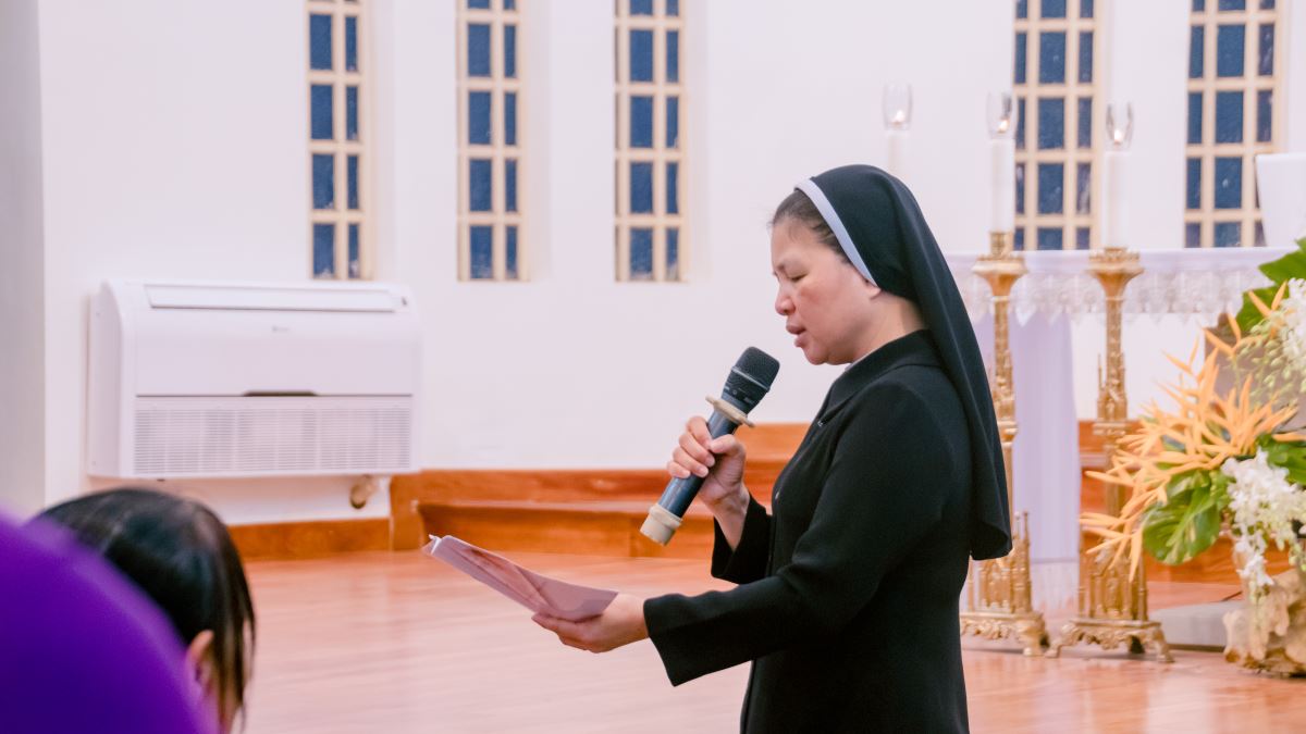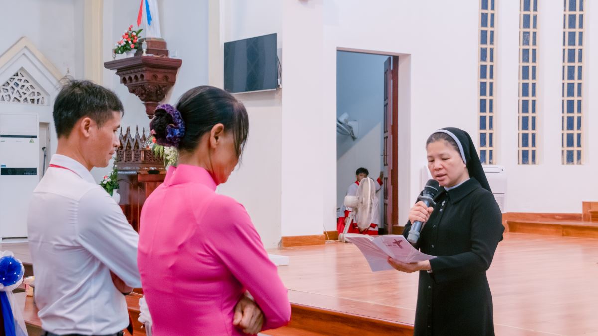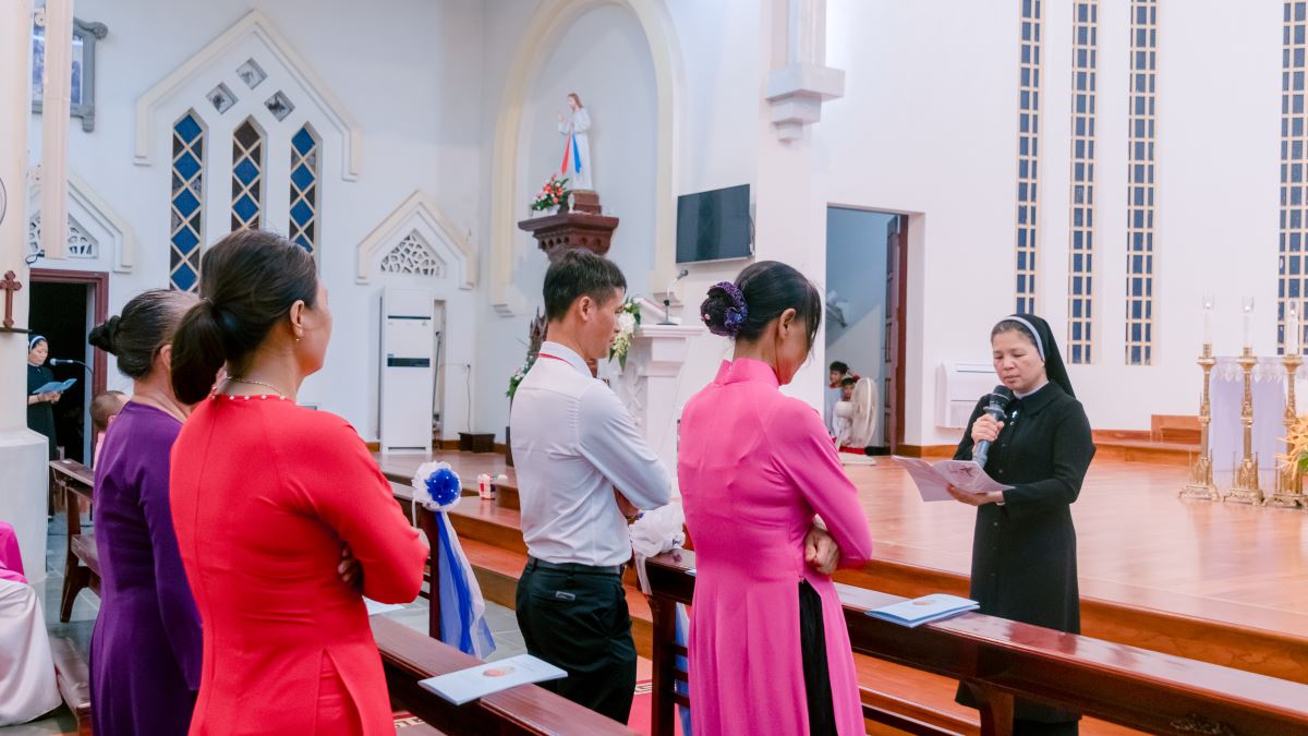 Tiếp đó, dì Tổng phụ trách Maria Đỗ Thị Thanh Huyền – đại diện Hội Dòng đón nhận các anh chị em cam kết lần đầu vào đại gia đình Mến Thánh Giá Hưng Hoá.