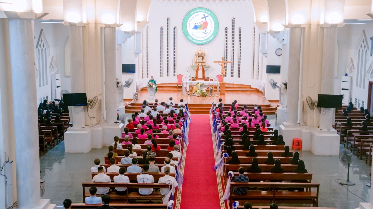 Sau đó, đoàn hành hương tiến vào nhà thờ để tham dự Thánh lễ Chúa Nhật XX Thường Niên.