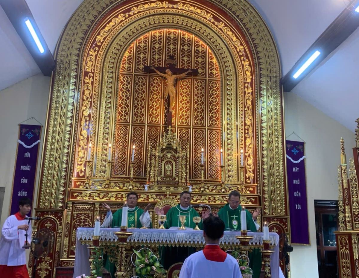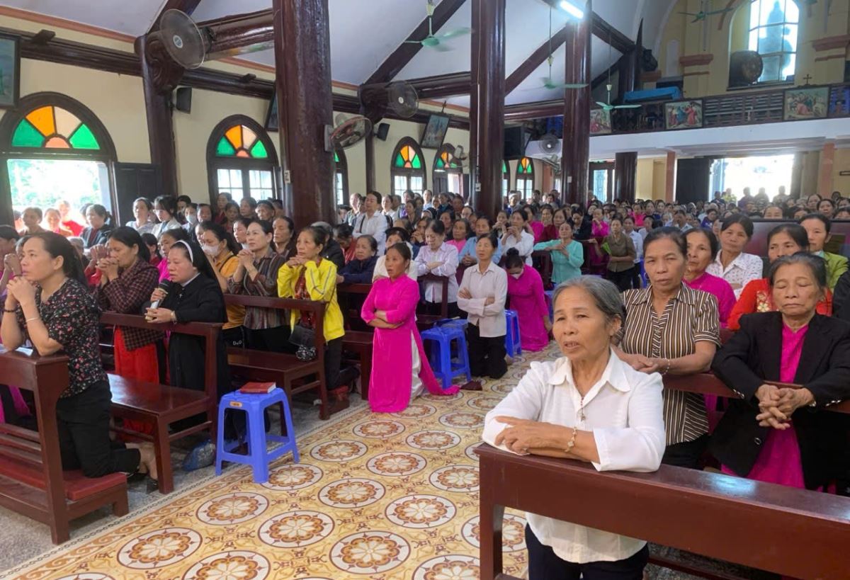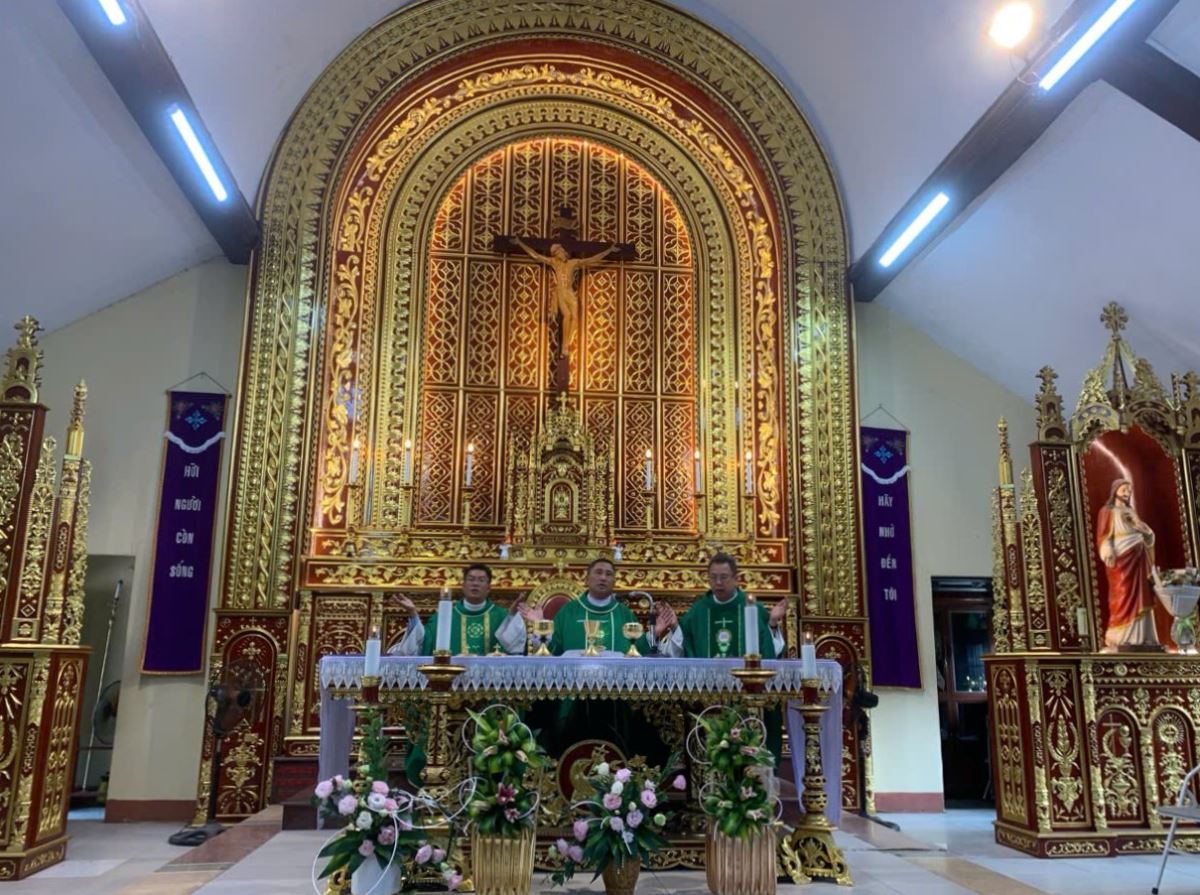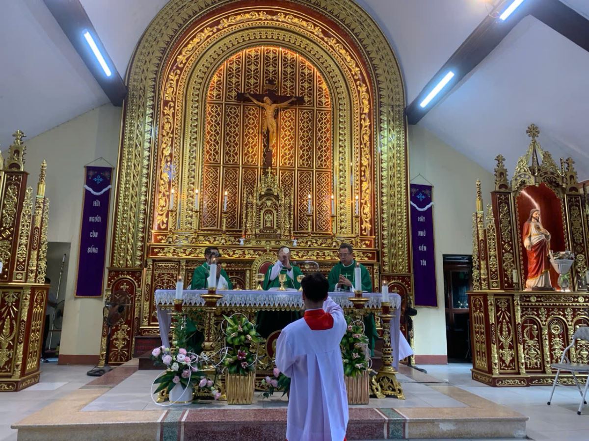 Thánh lễ do cha Giuse Chu Văn Khương chủ tế, cùng đồng tế với cha Phêrô Nguyễn Trường Thịnh và cha Phêrô Tạ Duy Tài. Hiệp dâng Thánh lễ còn có sự hiện diện của quý dì trợ úy, quý dì thuộc các cộng đoàn Mến Thánh Giá trong giáo hạt, cùng đông đảo các hội viên và bà con giáo dân trong và ngoài giáo hạt.