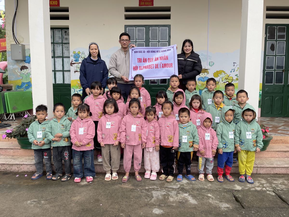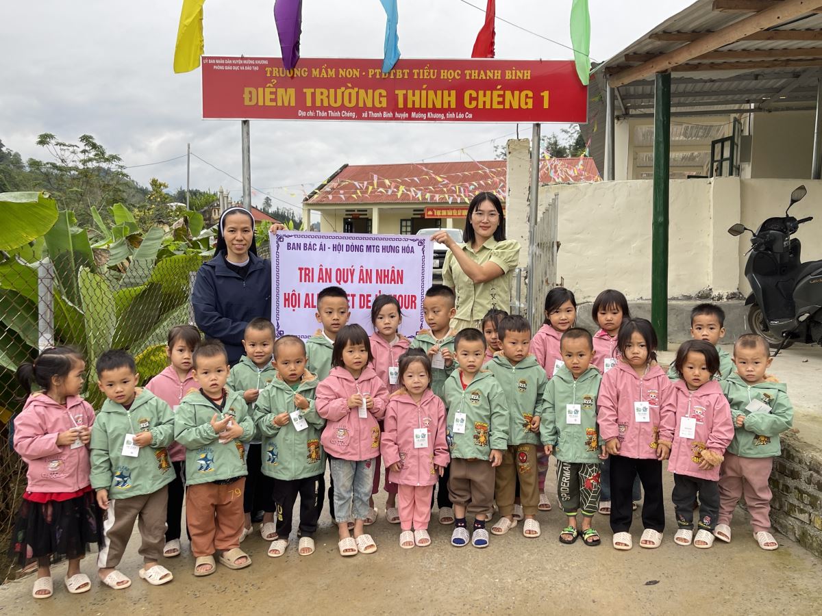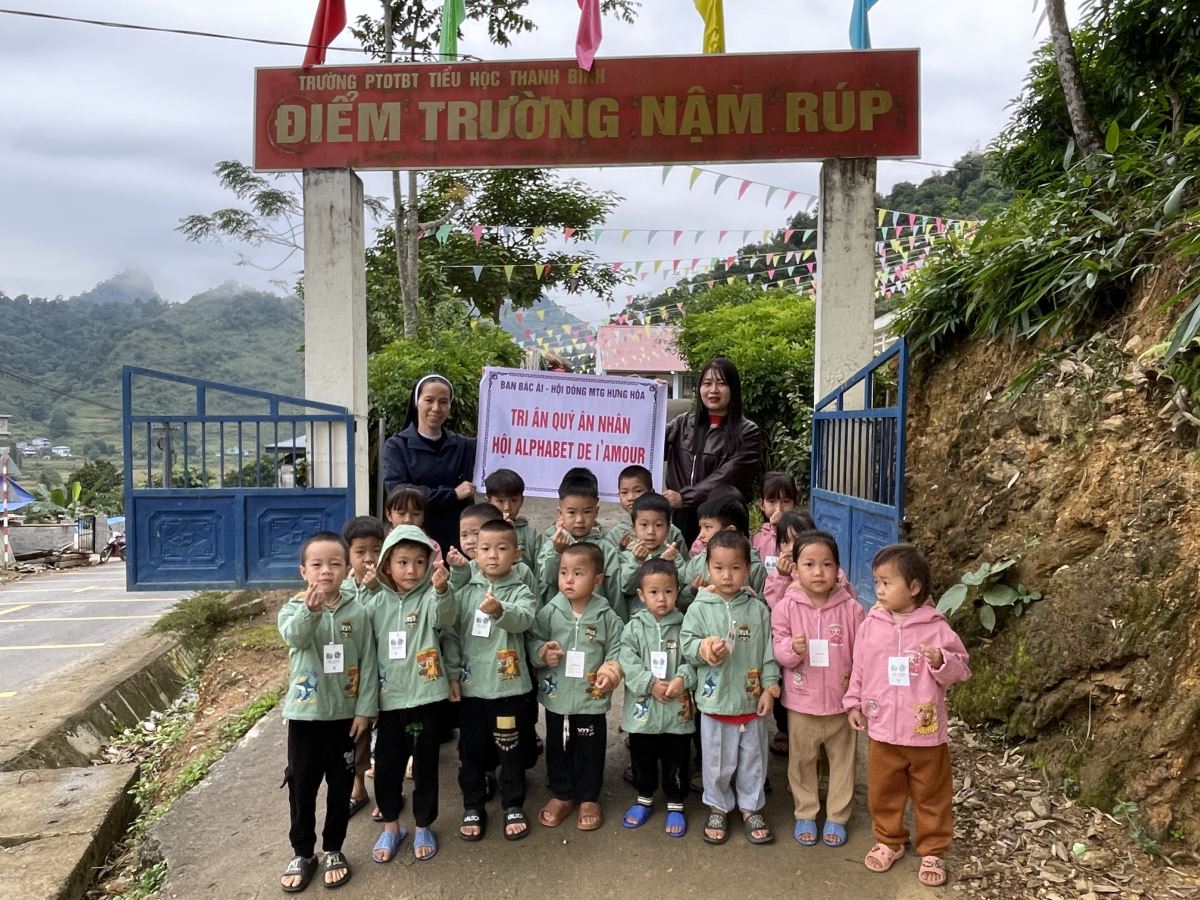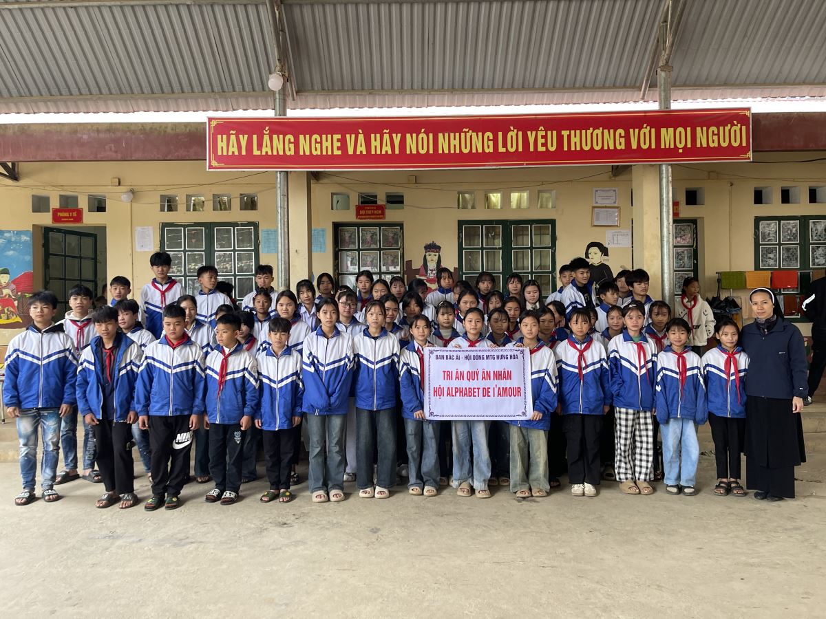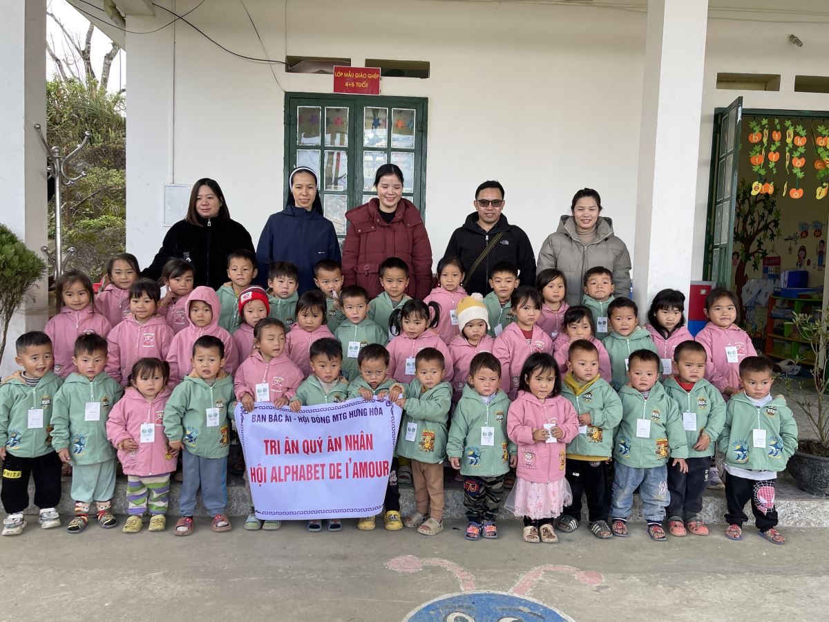 WMTGHH - Nhờ tấm lòng yêu thương và quảng đại của quý ân nhân Hội ALPHABET DE L’AMOUR, từ ngày 17 đến ngày 23 tháng 11 năm 2025, Ban Bác Ái Hội dòng Mến Thánh Giá Hưng Hóa đã gửi trao 1.130 chiếc áo ấm mùa đông đến 1.130 em học sinh người H’Mông, Nùng, Dao, Phù Lá… tại hơn 30 điểm Trường Mầm non và Trường Trung học cơ sở thuộc 5 xã: Dìn Chin, Pha Long, Cao Sơn, Bản Lầu, Mường Khương, cùng nhiều bản làng khác của tỉnh Lào Cai.