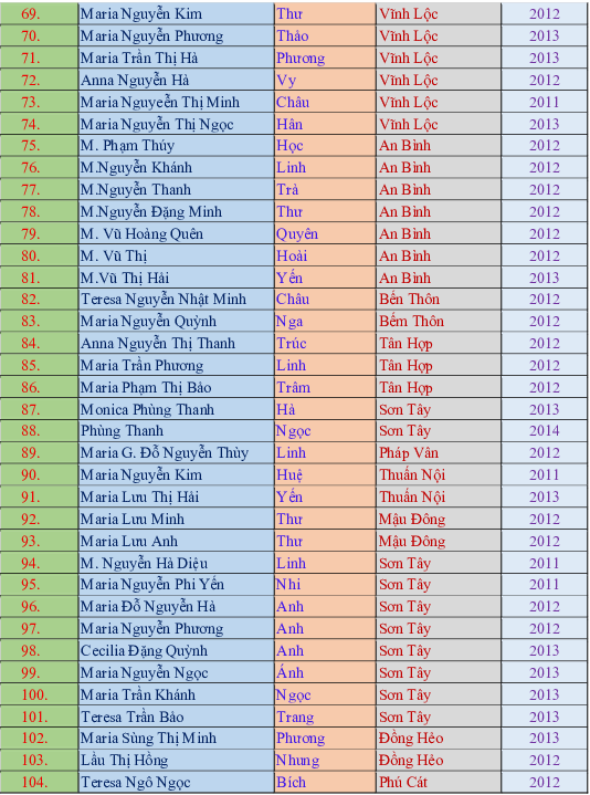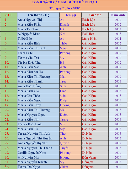 Danh sách các em dự tu hè Khóa 1 từ ngày 25/06 - 30/06/2025 tại Hội dòng Mến Thánh Giá Hưng Hóa