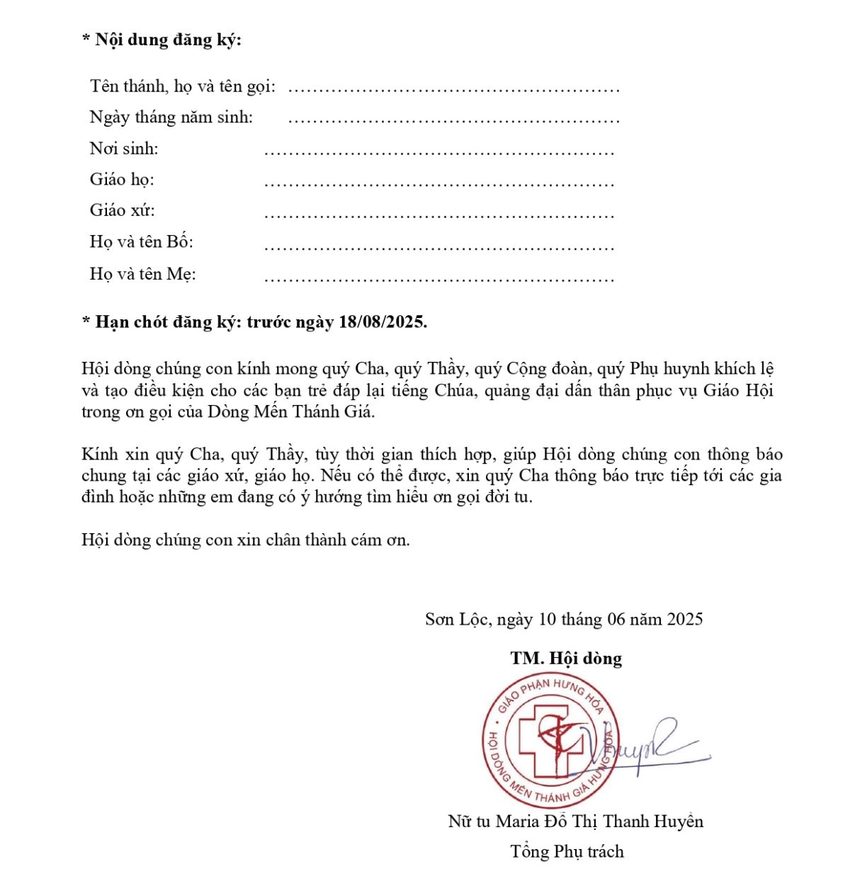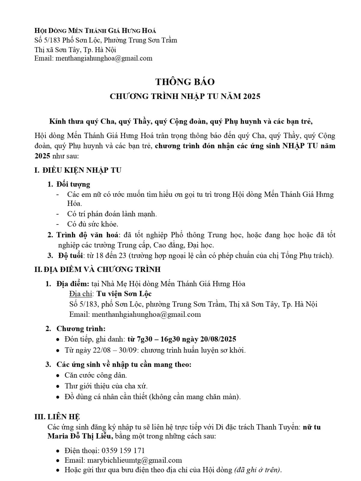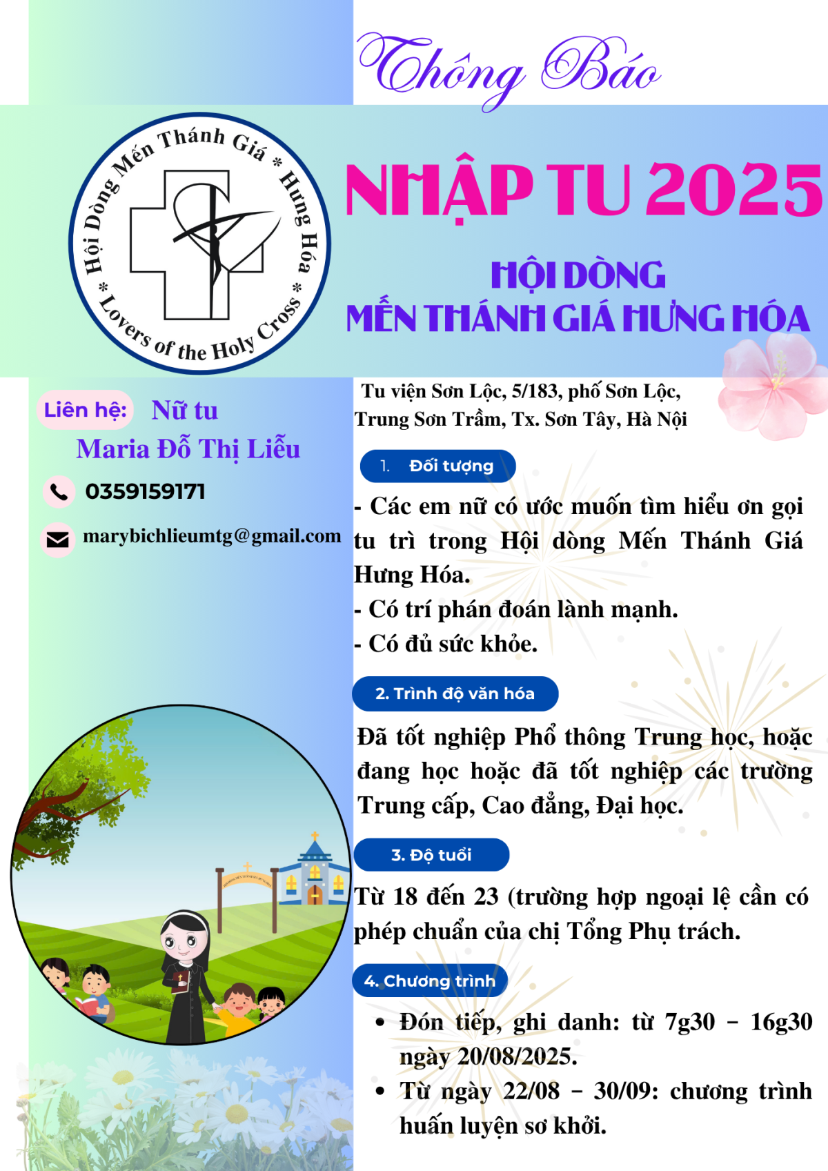 Hội dòng Mến Thánh Giá Hưng Hóa: Thông báo chương trình NHẬP TU năm 2025