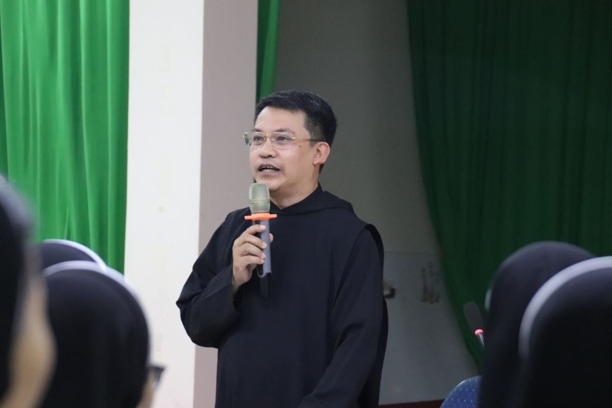 Chị Giám sư Học viện giới thiệu Cha giảng phòng với quý chị em tham dự tuần tĩnh tâm Tĩnh tâm năm là điểm nhấn quan trọng trong hành trình tu trì. Trong tuần tĩnh tâm, chị em học viện được mời gọi “dừng lại” giữa những bận rộn của việc học tập và mục vụ, để “ở lại” với Chúa Giêsu – Đấng là nguồn sống và tình yêu. Chủ đề tĩnh tâm năm nay “Bén rễ sâu vào trong Đức Kitô” trở nên lời mời sâu lắng, thôi thúc mỗi người bước vào tương quan mật thiết hơn với Thầy Giêsu qua cầu nguyện, thinh lặng và suy niệm Lời Chúa.