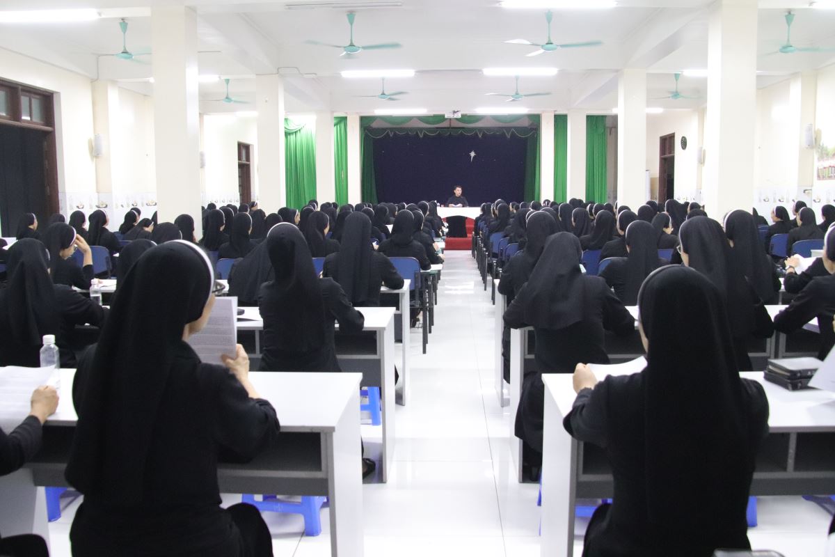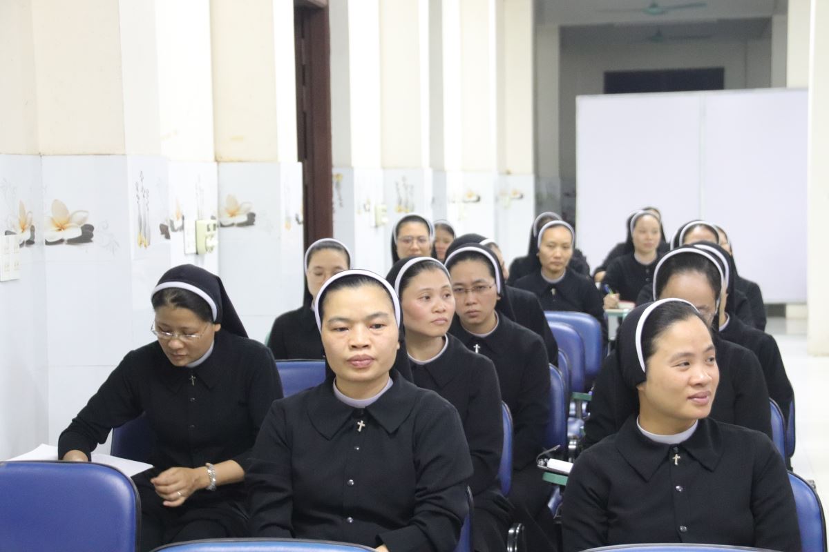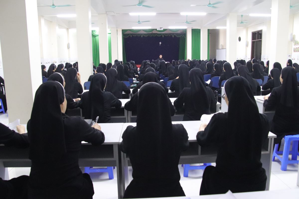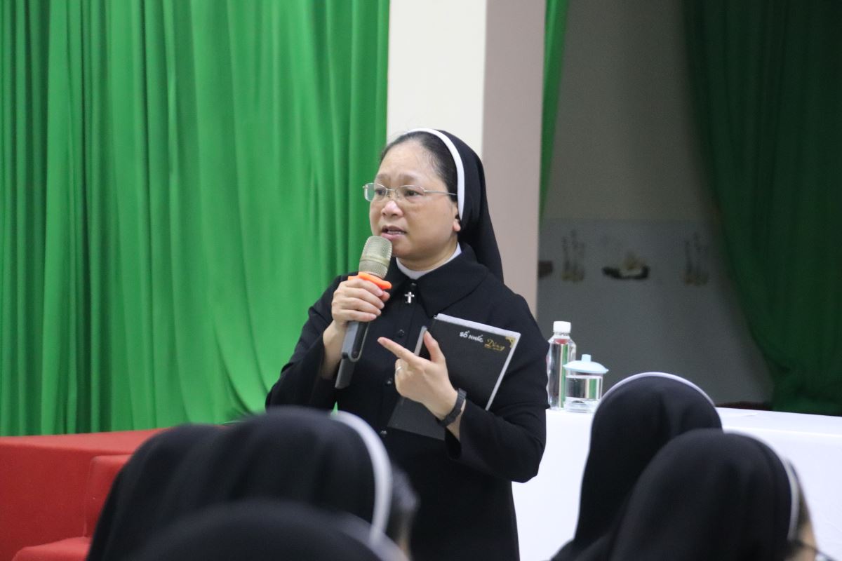 Để bước vào tuần tĩnh tâm được sốt sắng và thiêng liêng hơn, chị Giám sư Học viện – nữ tu Maria Nguyễn Thị Thay – đã dành ít phút trước khi tuần tĩnh tâm được chính thức bắt đầu, để gặp gỡ thân tình với toàn thể chị em tham dự. Trong tâm tình yêu thương và hiệp thông, Chị đã thân ái gửi lời chào mừng nồng hậu, cùng những lời chúc đầy khích lệ. Chị ước mong mỗi người có thể mở rộng tâm hồn đón nhận ơn Chúa, sống trọn vẹn từng giây phút thinh lặng, lắng nghe và để Lời Chúa dẫn dắt suốt hành trình tĩnh tâm này.