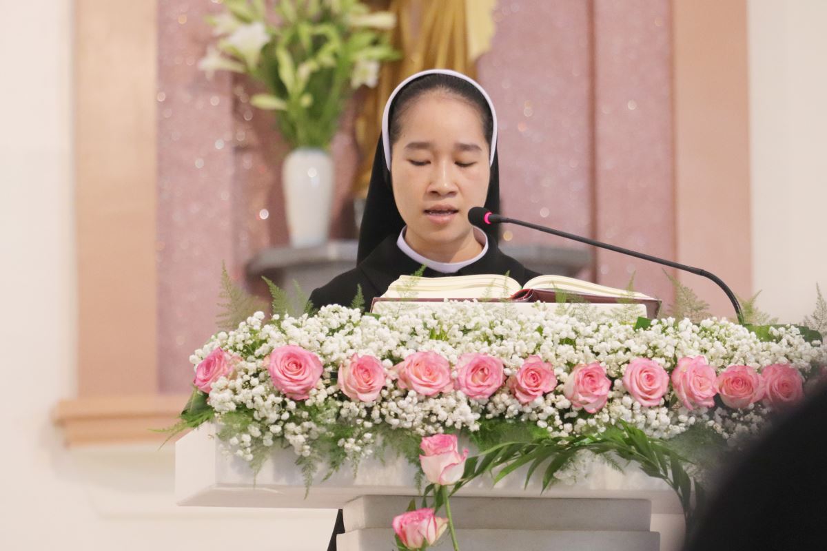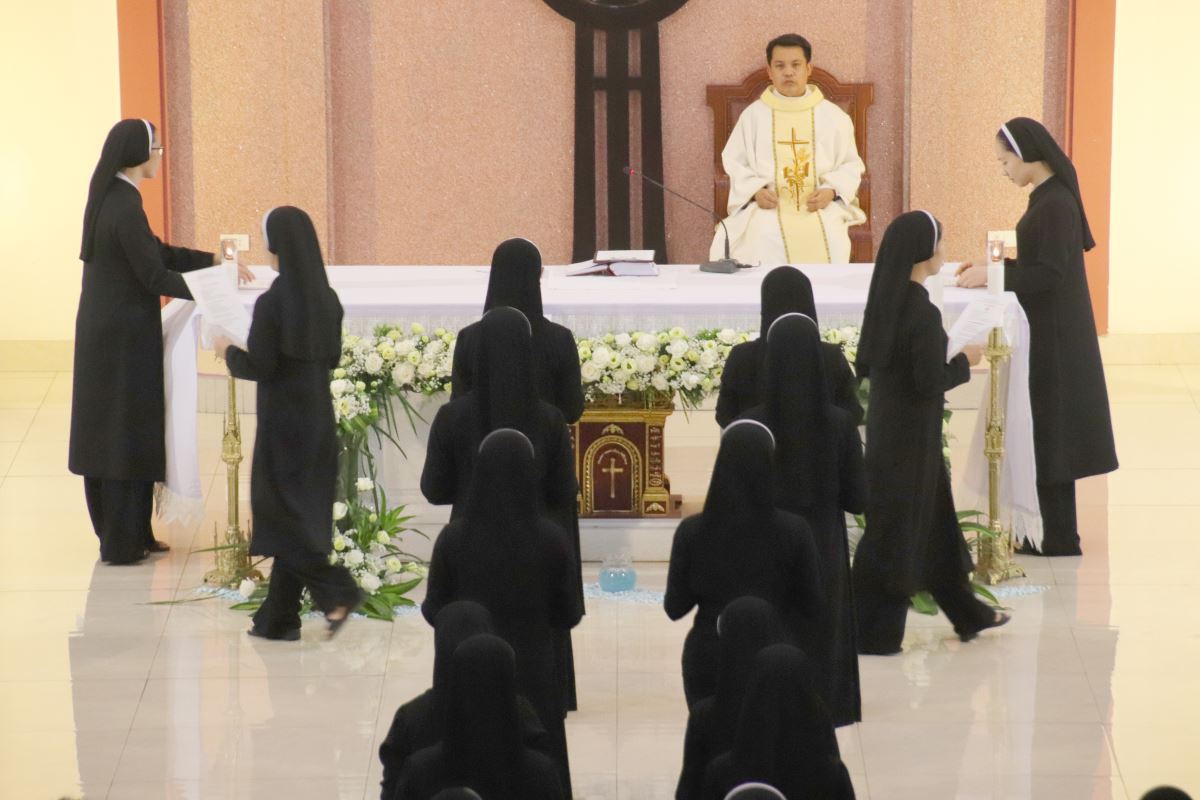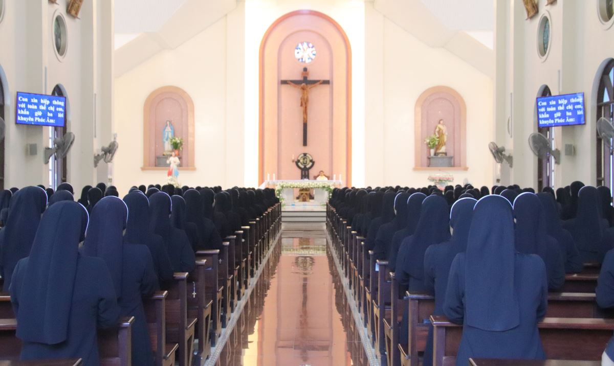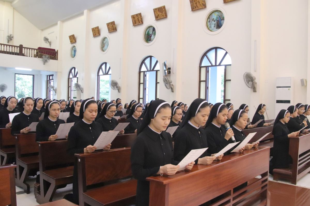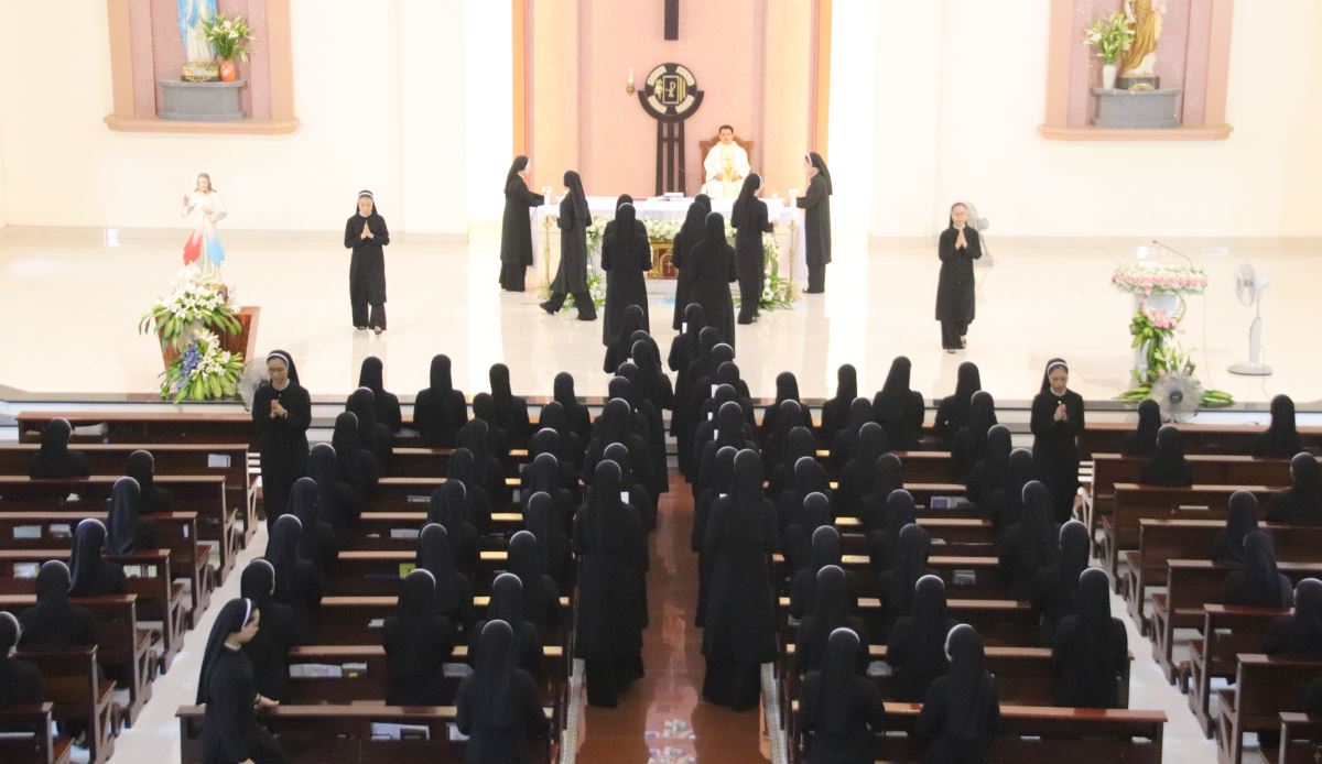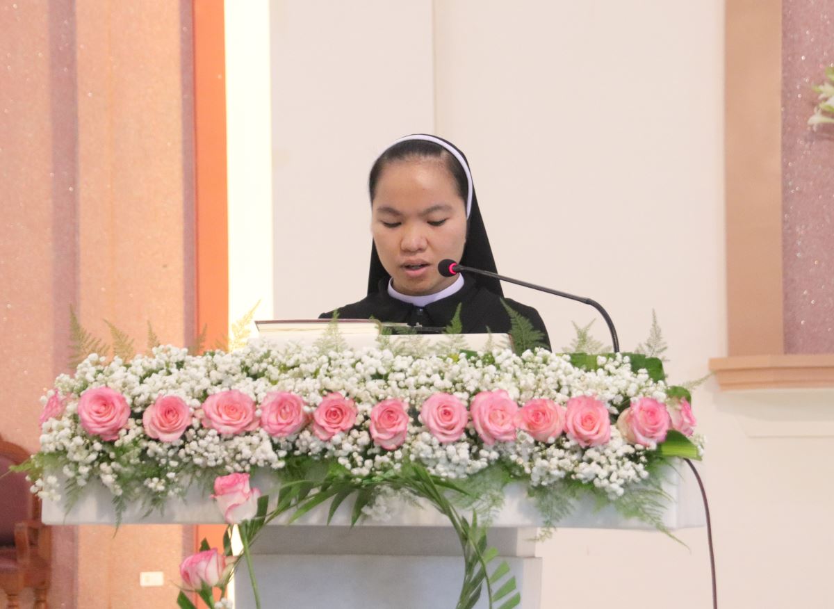 Cha giảng phòng Phanxicô Paola Huỳnh Hoàng Nam. OSB chủ tế Thánh lễ Trong bài giảng, cha Phanxicô Paola đã chia sẻ về niềm vui và tâm tình tri ân nhân dịp Lễ Tạ Ơn sau tuần tĩnh tâm của 185 nữ tu và nghi thức khấn tiếp của 81 nữ tu khối Học viện. Cha đã nhấn mạnh đây là sự kiện thánh thiêng, tràn đầy niềm vui, ân sủng và hạnh phúc thiêng liêng. Cha đã mời gọi cộng đoàn chiêm ngắm đời dâng hiến qua ba chiều kích: sự kiện thánh, mục đích thánh và cảm nghiệm thánh. Con số 81 được nhìn như dấu chỉ hồng ân và sự hoàn thiện, tượng trưng cho sự hiệp nhất trong đa dạng giữa cộng đoàn nữ tu. Tất cả cùng bước theo Chúa Kitô trên con đường thập giá, và mỗi người đều được mời gọi trung thành với lý tưởng “Đức Kitô Chịu Đóng Đinh là đối tượng duy nhất của lòng trí chúng con”. Mục đích của đời tu là tìm kiếm Chúa và hạnh phúc Nước Trời. Theo Chúa là chọn lối sống thánh thiện, sống hạnh phúc thật trong Ngài. Chúa chính là nguồn hạnh phúc vĩnh cửu, và những ai thực tâm tìm kiếm Ngài sẽ được hạnh phúc đời này lẫn đời sau. Theo Chúa là cảm nghiệm được niềm vui sâu xa của đời sống thánh hiến qua cầu nguyện, phụng vụ và truyền giáo. Niềm vui ấy không phải là cảm xúc chóng qua, mà là hoa trái của việc ở lại trong Chúa và sống trong cộng đoàn hiệp nhất yêu thương. Như Đức Giáo Hoàng Phanxicô nói: “Nơi đâu có tu sĩ, nơi đó có niềm vui”. Cuối cùng, Cha gửi lời cầu chúc tới 81 chị em khối Học viện sẽ khấn tiếp hôm nay luôn trung thành với ơn gọi và sống trọn vẹn ba điều thánh trong Hội Dòng cho đến trọn đời, trở nên những chứng nhân thánh thiện giữa trần gian.