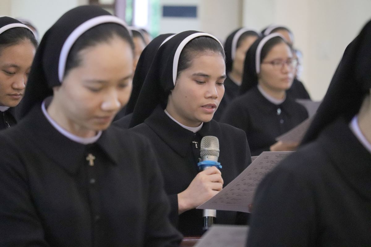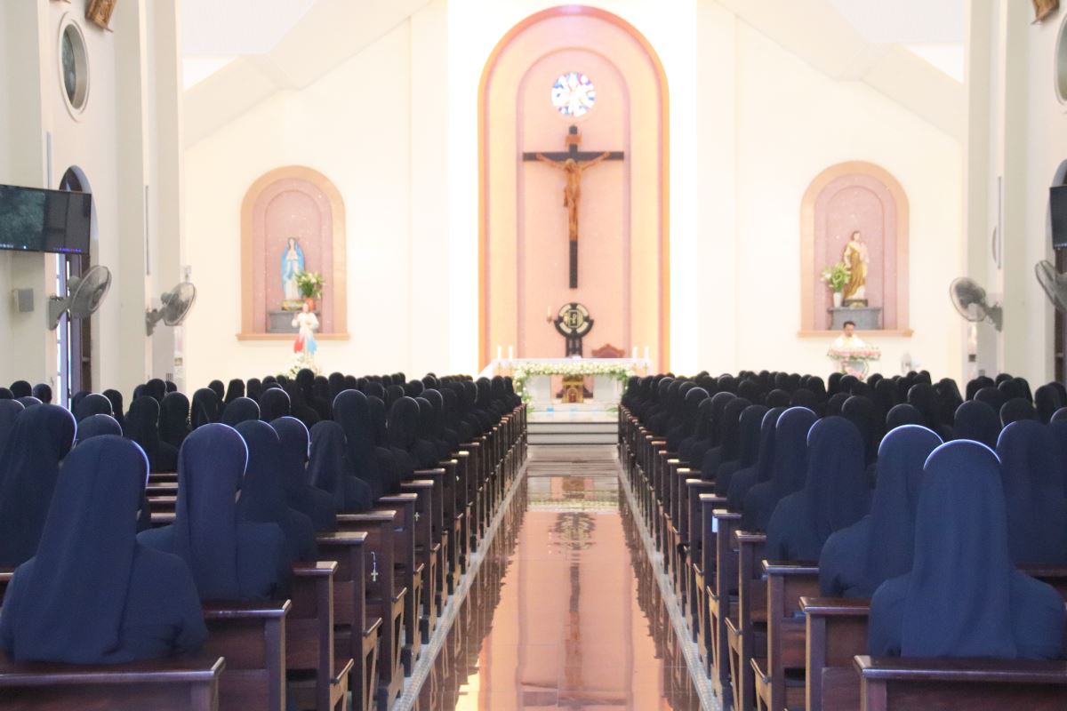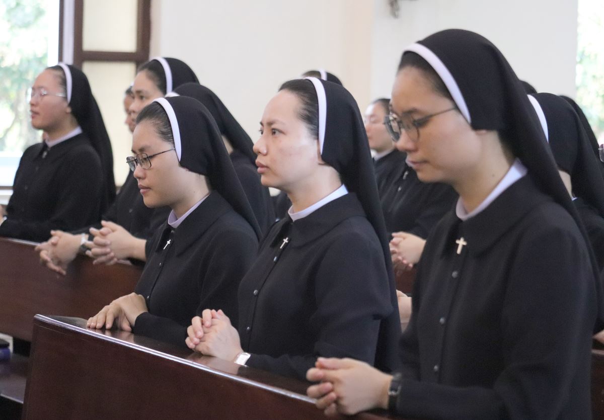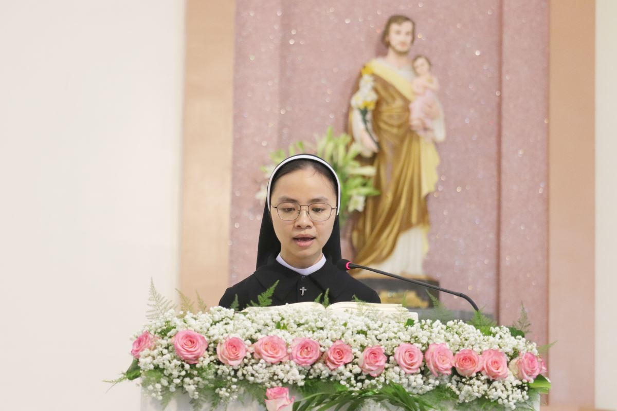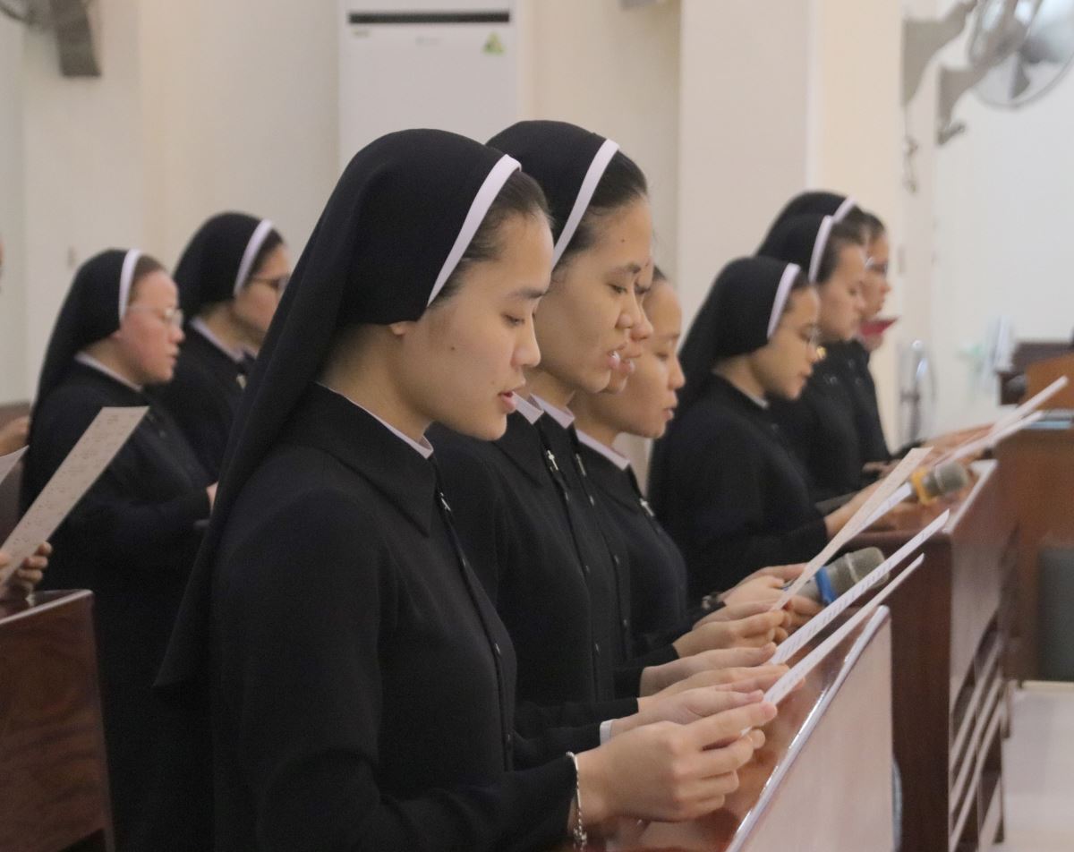 Cha giảng phòng Phanxicô Paola Huỳnh Hoàng Nam. OSB chủ tế Thánh lễ Trong bài giảng, cha Phanxicô Paola đã chia sẻ về niềm vui và tâm tình tri ân nhân dịp Lễ Tạ Ơn sau tuần tĩnh tâm của 185 nữ tu và nghi thức khấn tiếp của 81 nữ tu khối Học viện. Cha đã nhấn mạnh đây là sự kiện thánh thiêng, tràn đầy niềm vui, ân sủng và hạnh phúc thiêng liêng. Cha đã mời gọi cộng đoàn chiêm ngắm đời dâng hiến qua ba chiều kích: sự kiện thánh, mục đích thánh và cảm nghiệm thánh. Con số 81 được nhìn như dấu chỉ hồng ân và sự hoàn thiện, tượng trưng cho sự hiệp nhất trong đa dạng giữa cộng đoàn nữ tu. Tất cả cùng bước theo Chúa Kitô trên con đường thập giá, và mỗi người đều được mời gọi trung thành với lý tưởng “Đức Kitô Chịu Đóng Đinh là đối tượng duy nhất của lòng trí chúng con”. Mục đích của đời tu là tìm kiếm Chúa và hạnh phúc Nước Trời. Theo Chúa là chọn lối sống thánh thiện, sống hạnh phúc thật trong Ngài. Chúa chính là nguồn hạnh phúc vĩnh cửu, và những ai thực tâm tìm kiếm Ngài sẽ được hạnh phúc đời này lẫn đời sau. Theo Chúa là cảm nghiệm được niềm vui sâu xa của đời sống thánh hiến qua cầu nguyện, phụng vụ và truyền giáo. Niềm vui ấy không phải là cảm xúc chóng qua, mà là hoa trái của việc ở lại trong Chúa và sống trong cộng đoàn hiệp nhất yêu thương. Như Đức Giáo Hoàng Phanxicô nói: “Nơi đâu có tu sĩ, nơi đó có niềm vui”. Cuối cùng, Cha gửi lời cầu chúc tới 81 chị em khối Học viện sẽ khấn tiếp hôm nay luôn trung thành với ơn gọi và sống trọn vẹn ba điều thánh trong Hội Dòng cho đến trọn đời, trở nên những chứng nhân thánh thiện giữa trần gian.