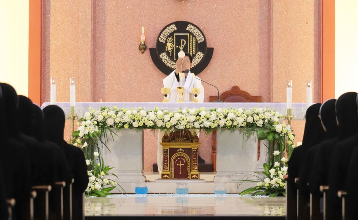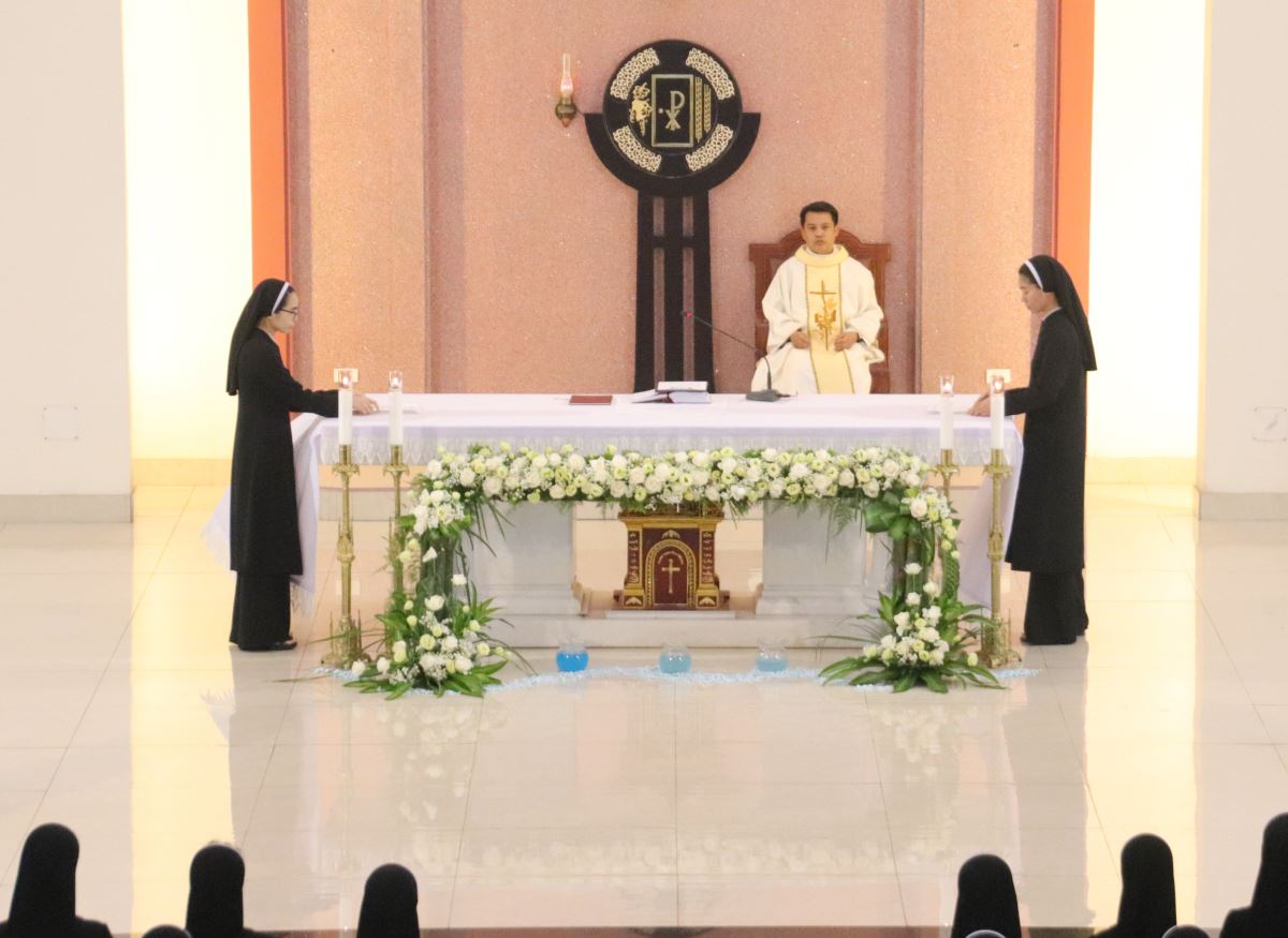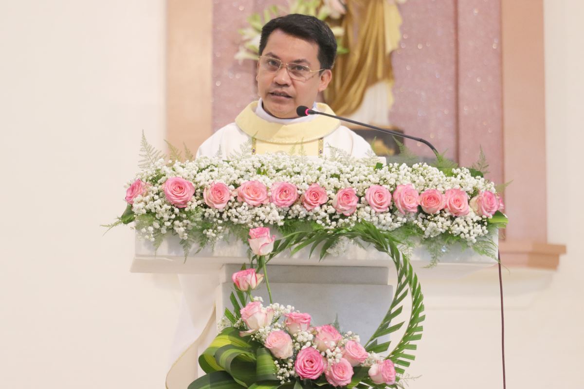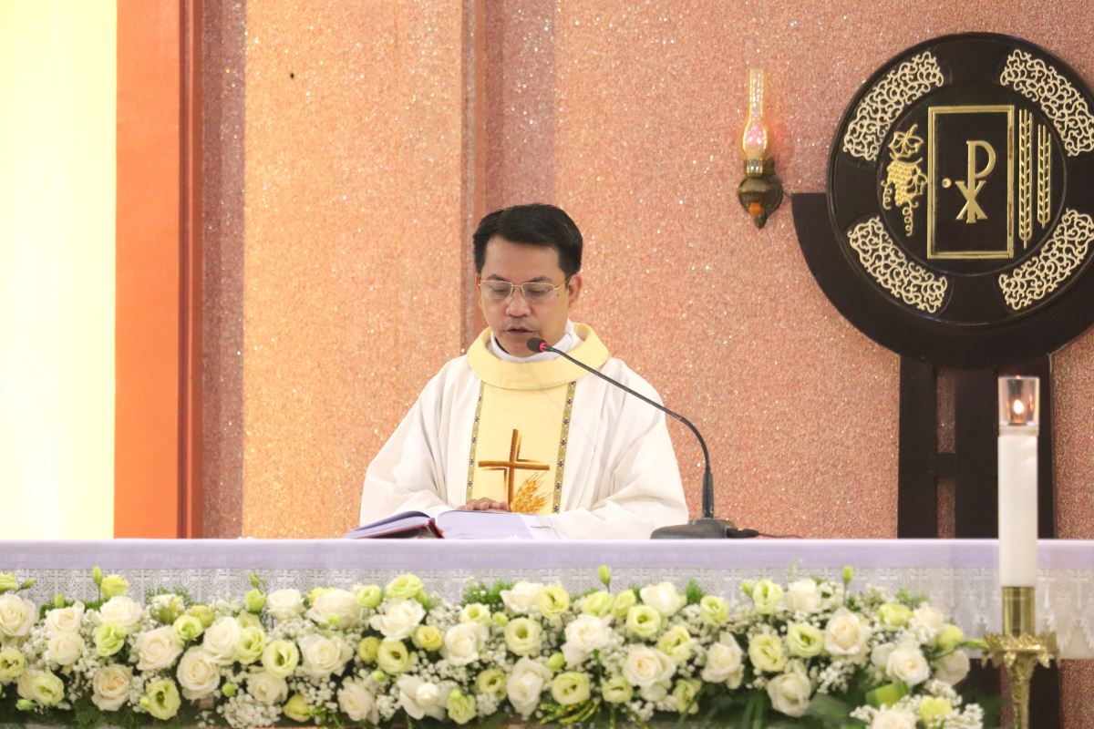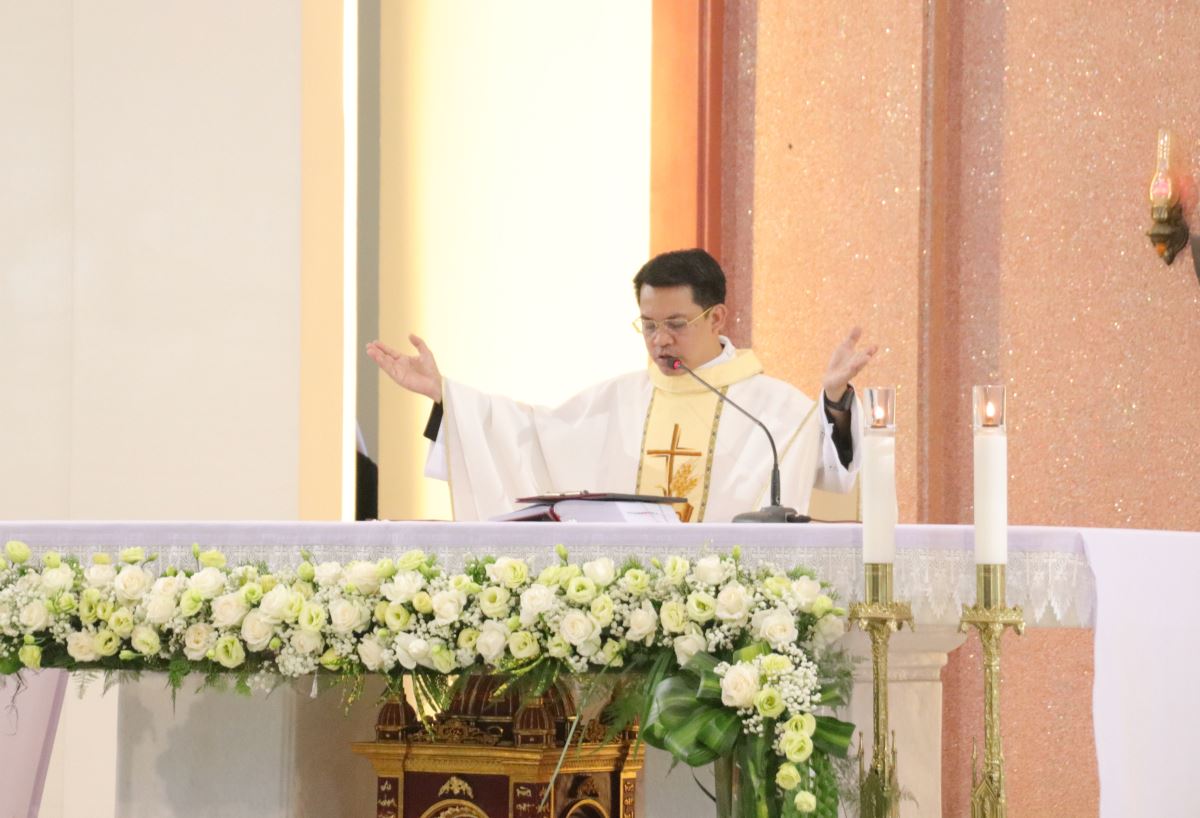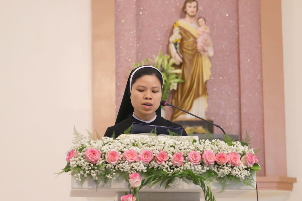 Cha giảng phòng Phanxicô Paola Huỳnh Hoàng Nam. OSB chủ tế Thánh lễ Trong bài giảng, cha Phanxicô Paola đã chia sẻ về niềm vui và tâm tình tri ân nhân dịp Lễ Tạ Ơn sau tuần tĩnh tâm của 185 nữ tu và nghi thức khấn tiếp của 81 nữ tu khối Học viện. Cha đã nhấn mạnh đây là sự kiện thánh thiêng, tràn đầy niềm vui, ân sủng và hạnh phúc thiêng liêng. Cha đã mời gọi cộng đoàn chiêm ngắm đời dâng hiến qua ba chiều kích: sự kiện thánh, mục đích thánh và cảm nghiệm thánh. Con số 81 được nhìn như dấu chỉ hồng ân và sự hoàn thiện, tượng trưng cho sự hiệp nhất trong đa dạng giữa cộng đoàn nữ tu. Tất cả cùng bước theo Chúa Kitô trên con đường thập giá, và mỗi người đều được mời gọi trung thành với lý tưởng “Đức Kitô Chịu Đóng Đinh là đối tượng duy nhất của lòng trí chúng con”. Mục đích của đời tu là tìm kiếm Chúa và hạnh phúc Nước Trời. Theo Chúa là chọn lối sống thánh thiện, sống hạnh phúc thật trong Ngài. Chúa chính là nguồn hạnh phúc vĩnh cửu, và những ai thực tâm tìm kiếm Ngài sẽ được hạnh phúc đời này lẫn đời sau. Theo Chúa là cảm nghiệm được niềm vui sâu xa của đời sống thánh hiến qua cầu nguyện, phụng vụ và truyền giáo. Niềm vui ấy không phải là cảm xúc chóng qua, mà là hoa trái của việc ở lại trong Chúa và sống trong cộng đoàn hiệp nhất yêu thương. Như Đức Giáo Hoàng Phanxicô nói: “Nơi đâu có tu sĩ, nơi đó có niềm vui”. Cuối cùng, Cha gửi lời cầu chúc tới 81 chị em khối Học viện sẽ khấn tiếp hôm nay luôn trung thành với ơn gọi và sống trọn vẹn ba điều thánh trong Hội Dòng cho đến trọn đời, trở nên những chứng nhân thánh thiện giữa trần gian.