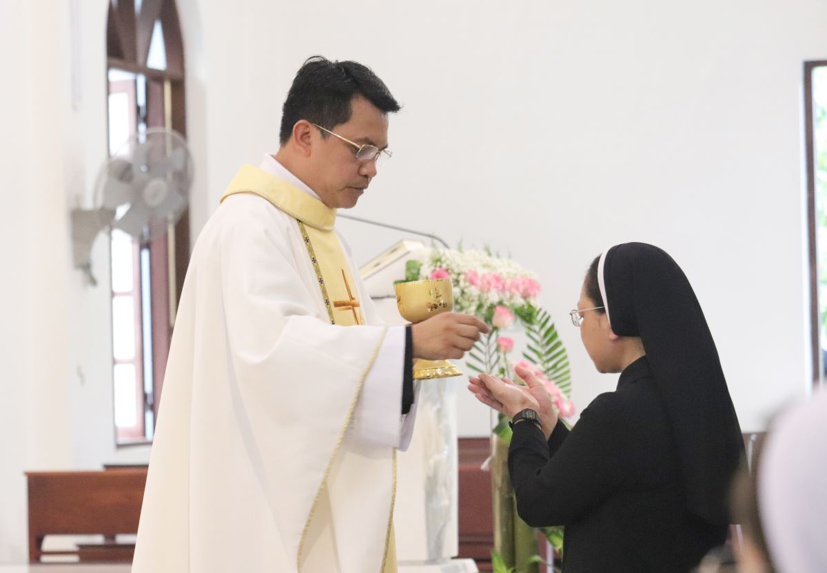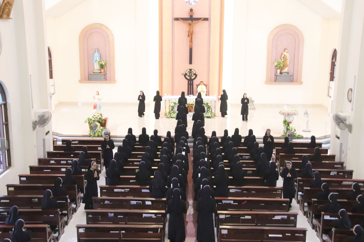 Thánh lễ do cha Phanxicô Paola Huỳnh Hoàng Nam. OSB – Cha giảng phòng và đồng hành trong suốt tuần tĩnh tâm chủ sự. Trong bầu khí trang nghiêm và sốt sắng, chị em khối Học viện và quý chị em khối khấn trọn đã cùng hiệp dâng lên Thiên Chúa lời cảm tạ sâu xa vì những ơn lành đã lãnh nhận trong những ngày tĩnh tâm: ơn trở về, ơn đổi mới, và ơn bình an nội tâm.