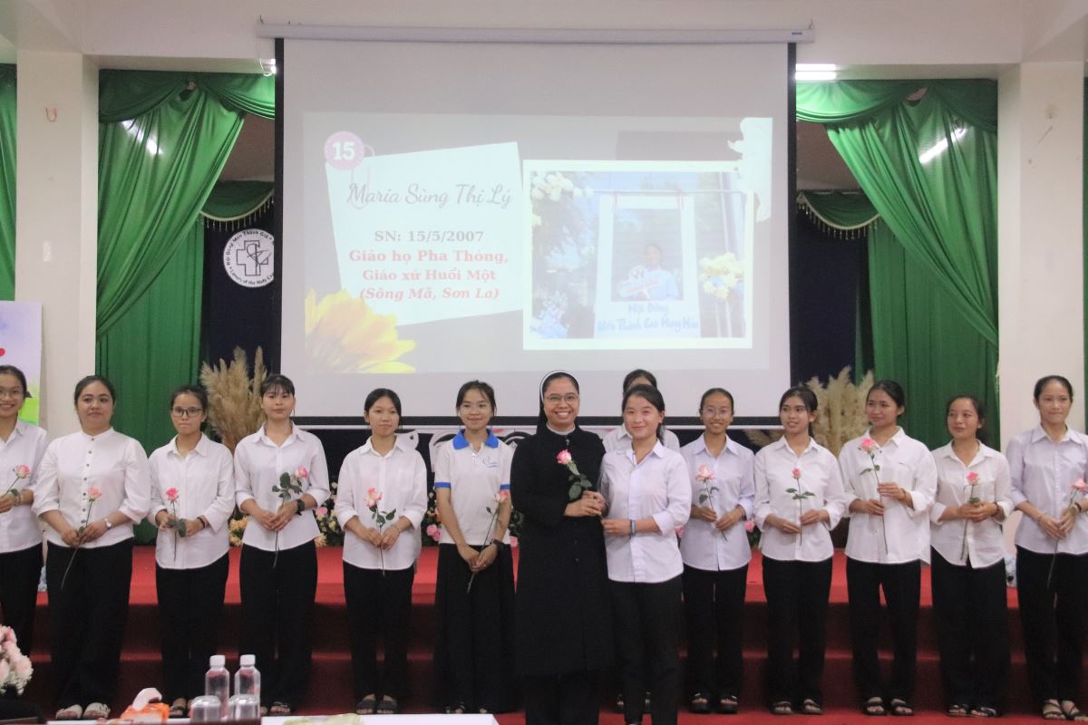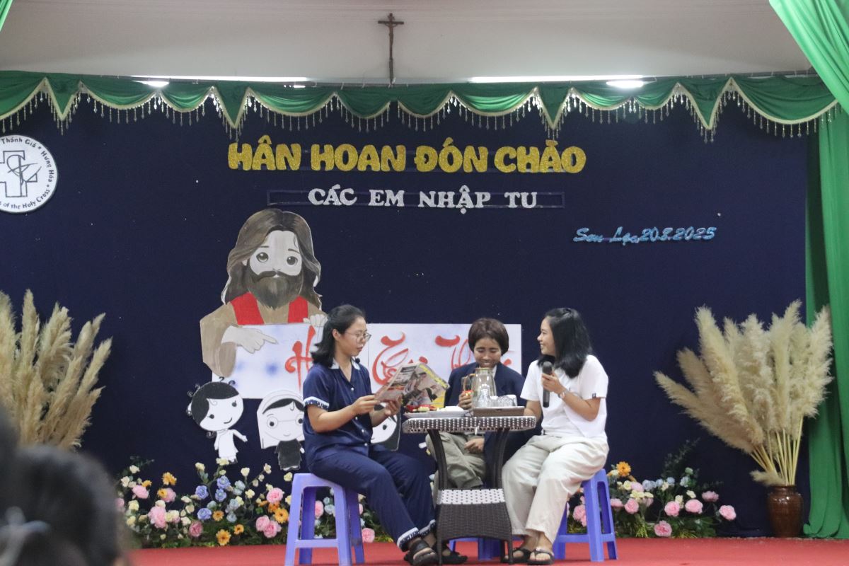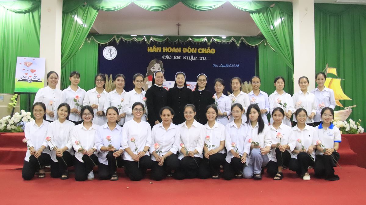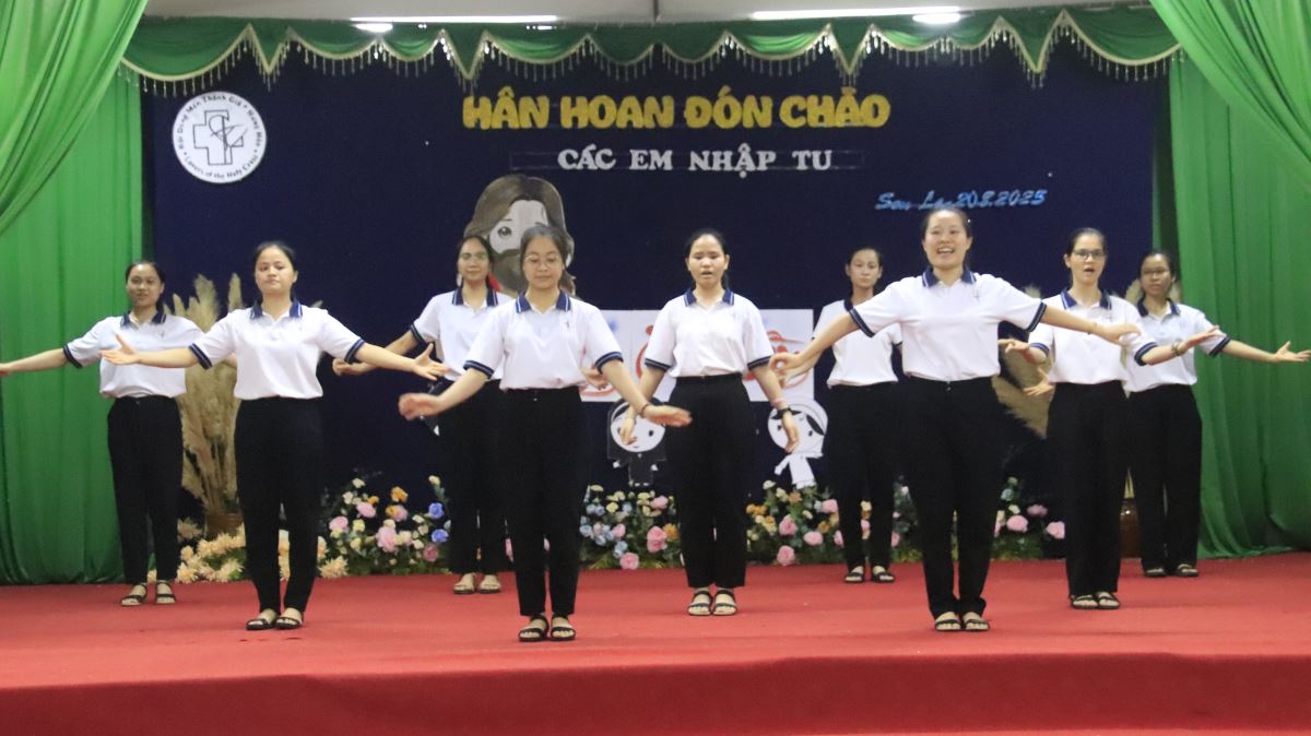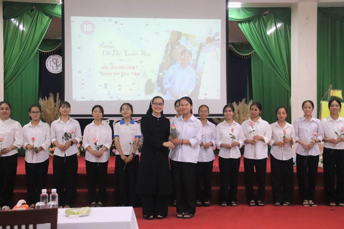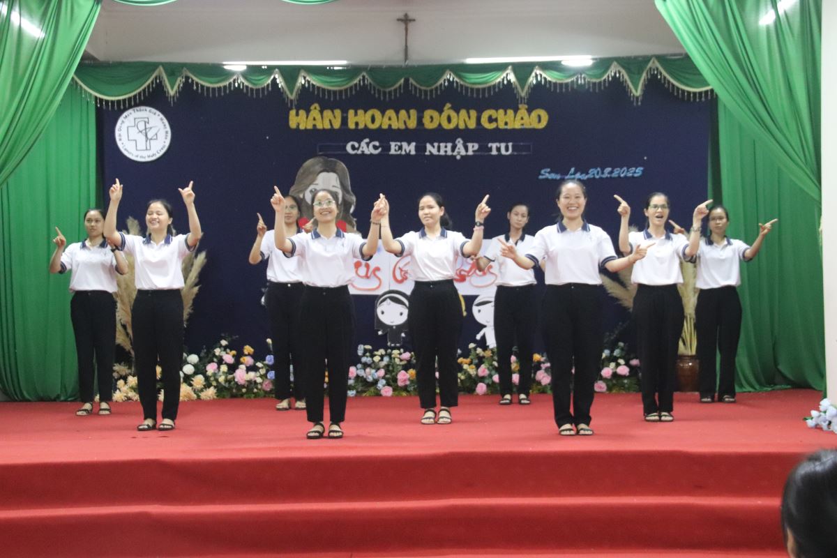 Sau lời nguyện xin ơn Chúa Thánh Thần, chương trình mở màn với tiết mục khởi động sôi động do khối Học viện trình diễn, thắp sáng bầu khí hội trường bằng tiếng cười rộn rã. Tiếp đó, chị Đặc trách khối Thanh tuyển Maria Đỗ Thị Liễu đã giới thiệu từng em nhập tu. Trong tiếng vỗ tay hân hoan của cộng đoàn, 26 em lần lượt tiến vào Hội trường. Các chị em khối Học viện ân cần trao tặng mỗi em một bông hồng thắm, như muốn nhắn gửi: “Các em là những đóa hoa bé nhỏ Chúa trồng trong vườn Hội Dòng, hãy nở rộ và tỏa ngát hương cho đời.”