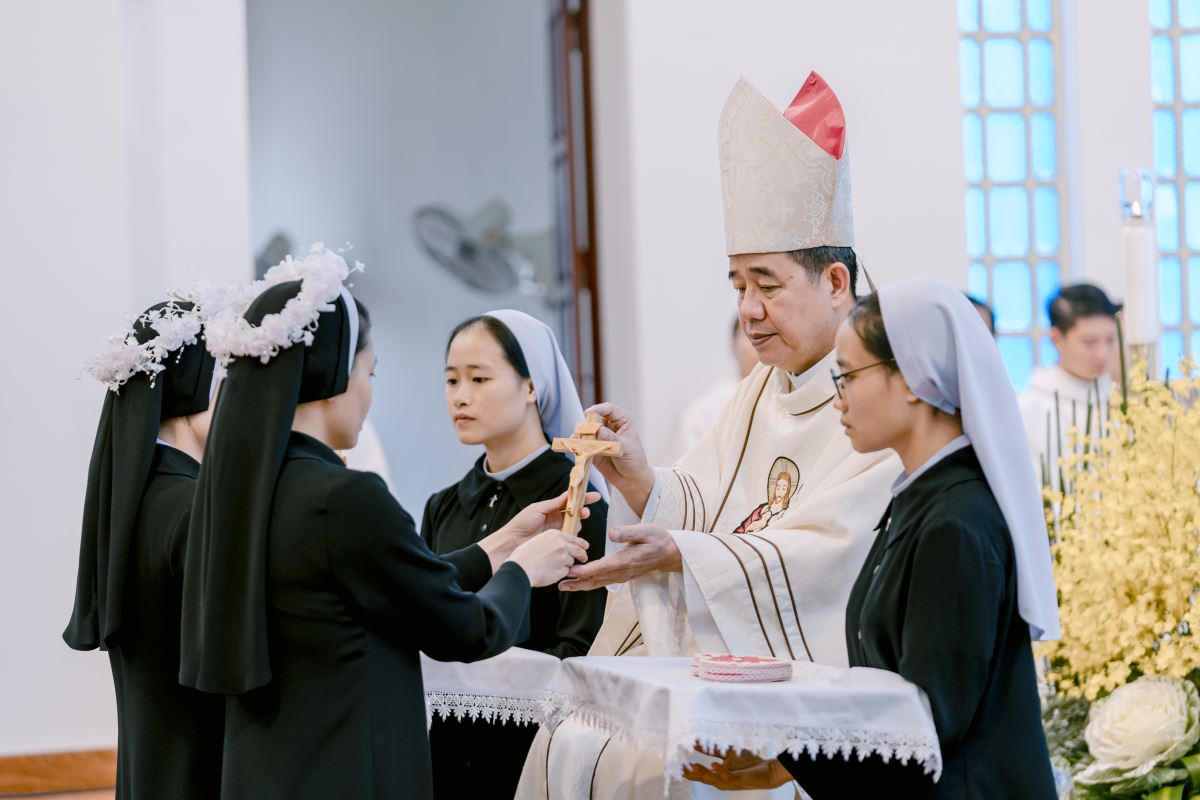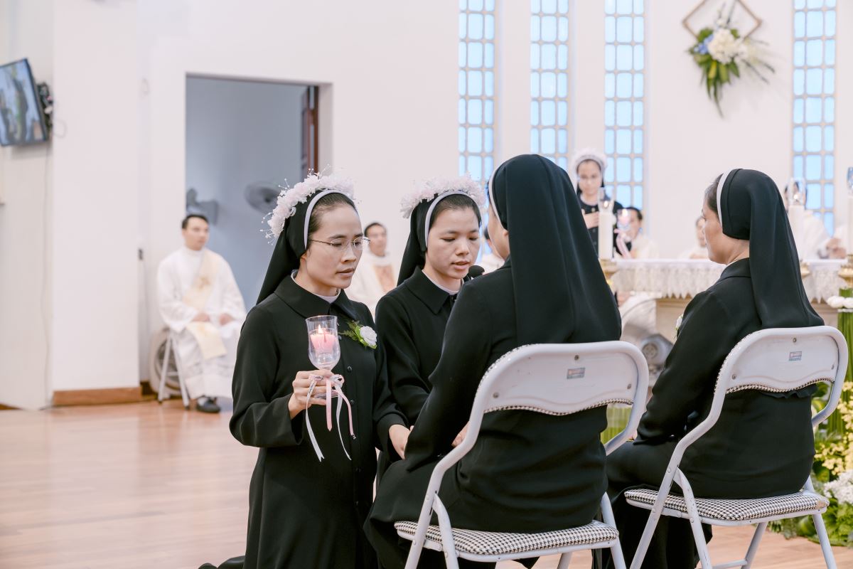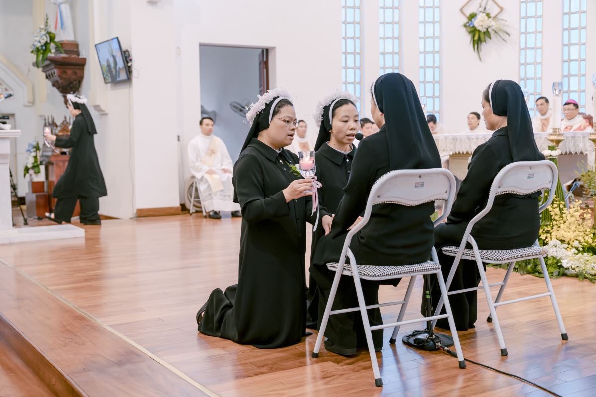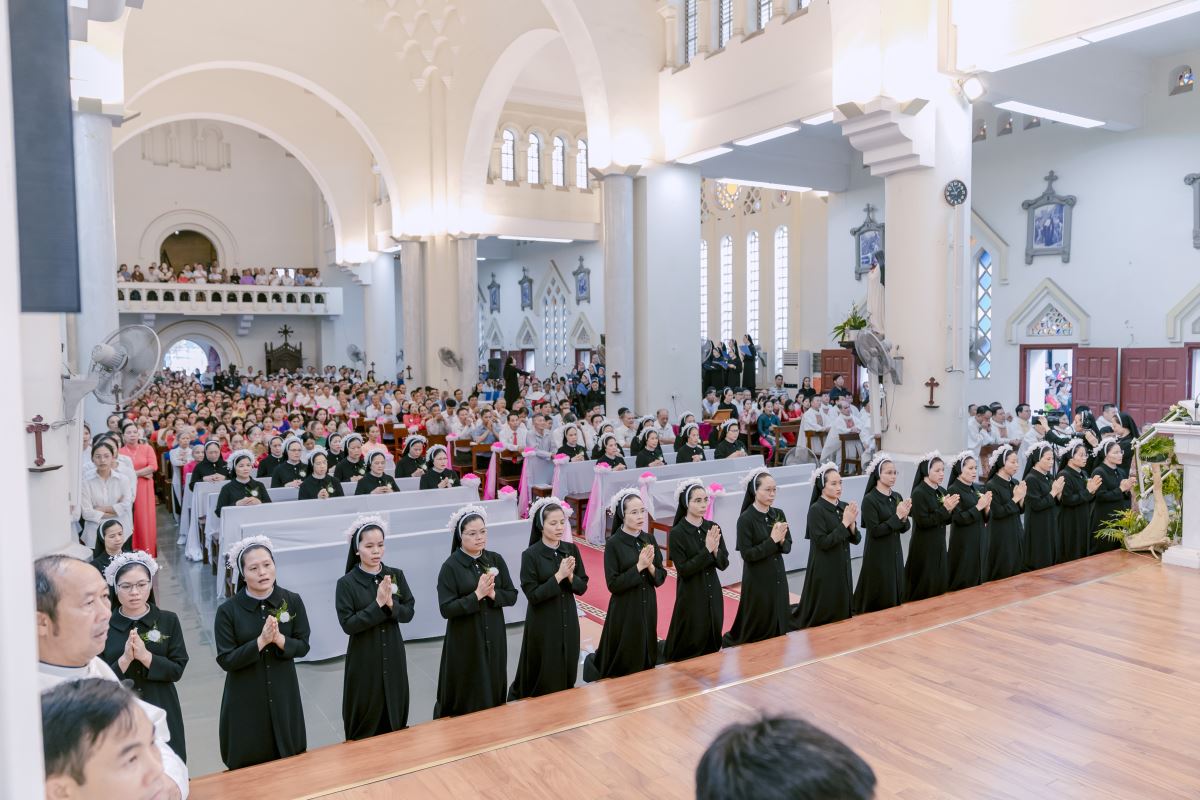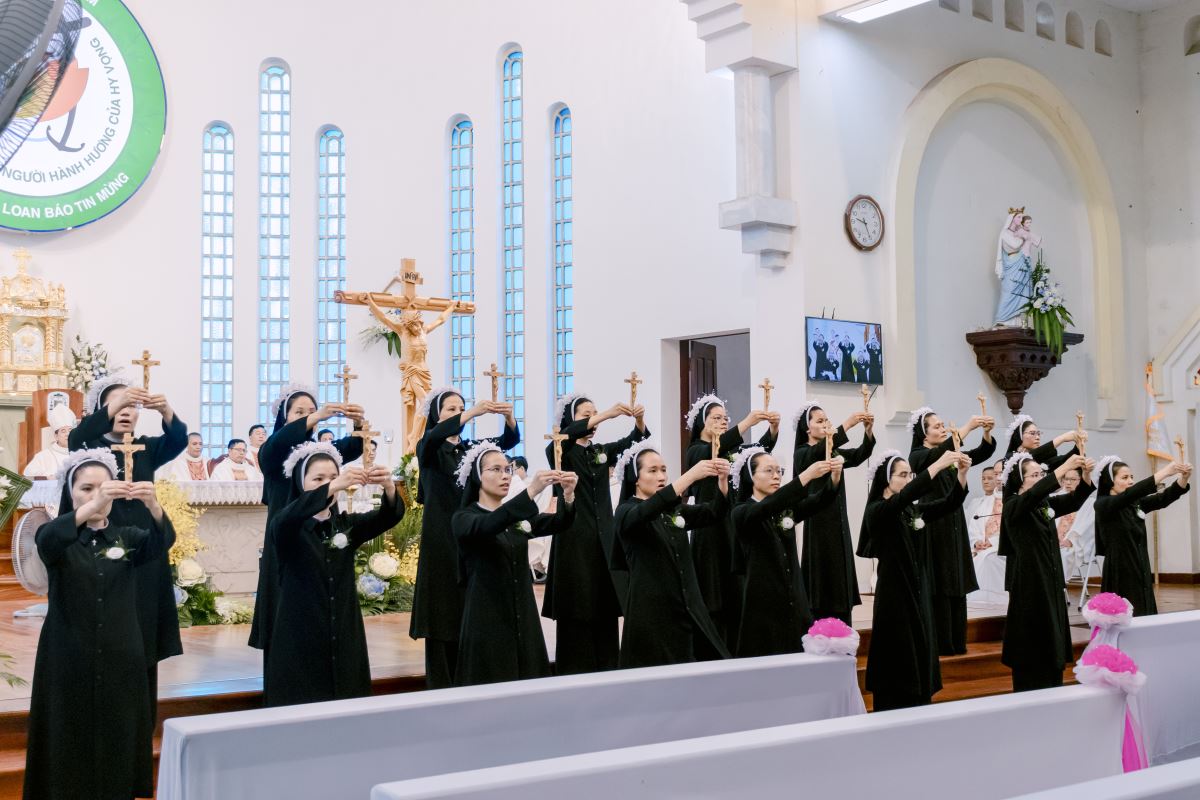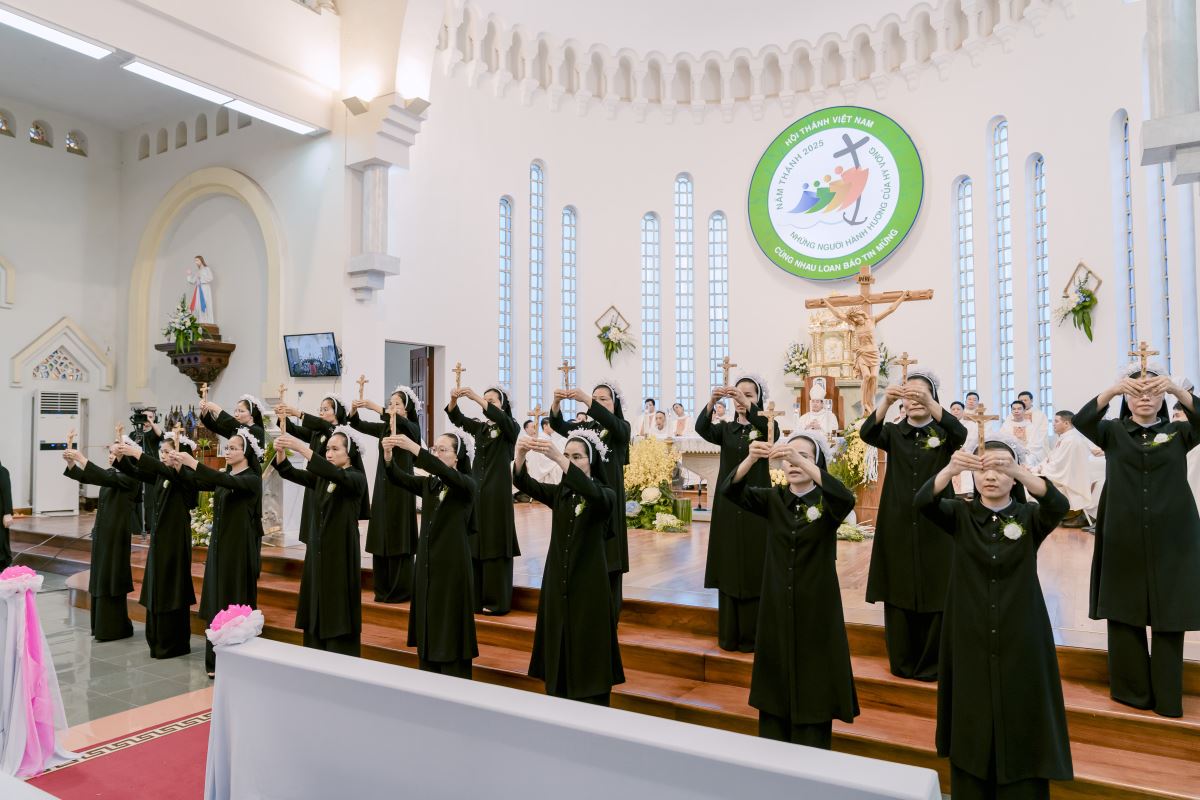 Thánh lễ khép lại trong niềm tạ ơn và hân hoan, khi những bó hoa tươi thắm được trao gửi, những nụ cười rạng rỡ nở trên môi và ánh mắt chan chứa yêu thương của các khấn sinh, gia đình cùng cộng đoàn như hòa quyện trong bản tình ca dâng hiến. Mọi cung bậc cảm xúc đều thấm đẫm ân tình Thiên Chúa, Đấng đã yêu thương, chọn gọi và nâng đỡ các chị trên hành trình thuộc trọn về Ngài. Nguyện xin Đức Trinh Nữ Maria và các Thánh Tử Đạo Việt Nam luôn đổ tràn ân phúc, chở che và nâng đỡ quý dì mừng Ngân khánh khấn dòng cùng các chị vừa tuyên khấn trọn đời, để từng ngày trong hành trình hiến dâng, các chị luôn bình an, trung tín và tràn đầy niềm vui thánh thiện. Ước gì tình yêu Thánh Giá mãi là nguồn suối ngọt lành nuôi dưỡng tâm hồn, để các chị ngày càng kết hiệp mật thiết hơn với Đức Giêsu Kitô Chịu Đóng Đinh – Đấng Tình Quân dịu dàng và trung tín, Đấng mà các chị đã chọn yêu và hiến trọn cả đời mình cho Ngài.