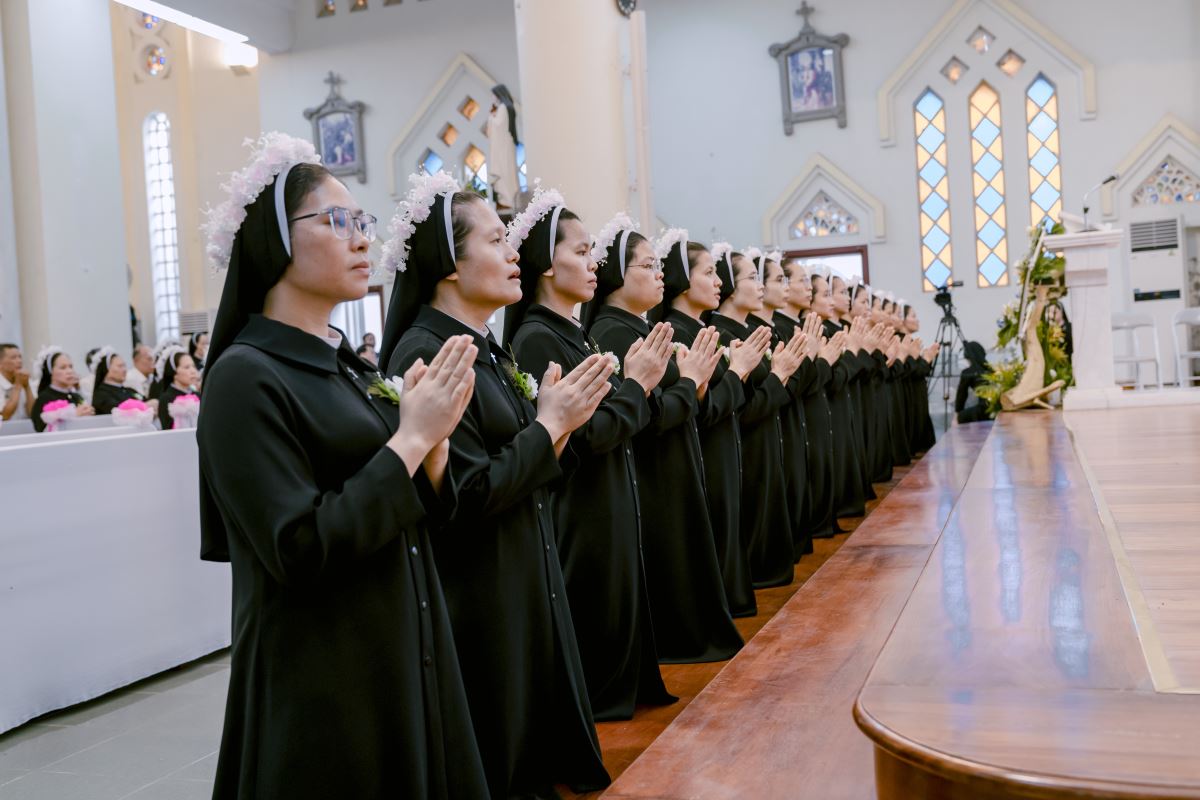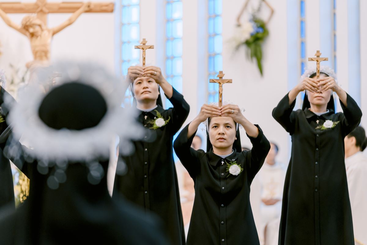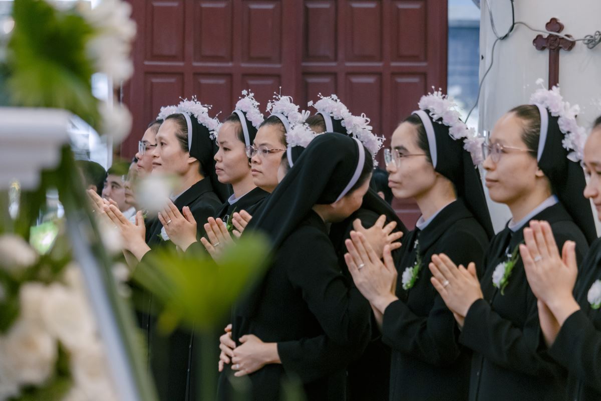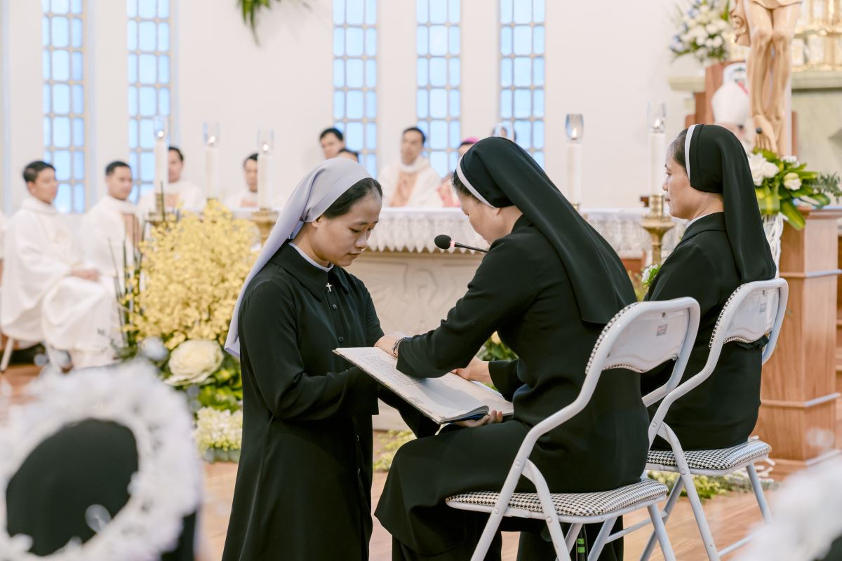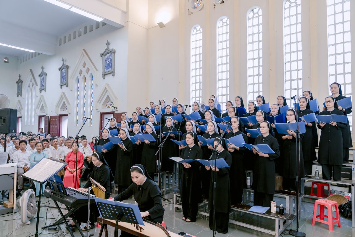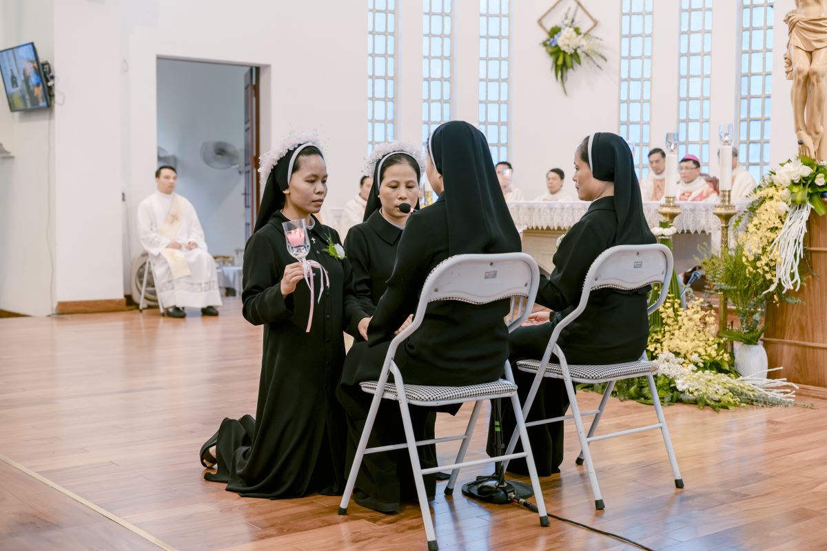 Thánh lễ khép lại trong niềm tạ ơn và hân hoan, khi những bó hoa tươi thắm được trao gửi, những nụ cười rạng rỡ nở trên môi và ánh mắt chan chứa yêu thương của các khấn sinh, gia đình cùng cộng đoàn như hòa quyện trong bản tình ca dâng hiến. Mọi cung bậc cảm xúc đều thấm đẫm ân tình Thiên Chúa, Đấng đã yêu thương, chọn gọi và nâng đỡ các chị trên hành trình thuộc trọn về Ngài. Nguyện xin Đức Trinh Nữ Maria và các Thánh Tử Đạo Việt Nam luôn đổ tràn ân phúc, chở che và nâng đỡ quý dì mừng Ngân khánh khấn dòng cùng các chị vừa tuyên khấn trọn đời, để từng ngày trong hành trình hiến dâng, các chị luôn bình an, trung tín và tràn đầy niềm vui thánh thiện. Ước gì tình yêu Thánh Giá mãi là nguồn suối ngọt lành nuôi dưỡng tâm hồn, để các chị ngày càng kết hiệp mật thiết hơn với Đức Giêsu Kitô Chịu Đóng Đinh – Đấng Tình Quân dịu dàng và trung tín, Đấng mà các chị đã chọn yêu và hiến trọn cả đời mình cho Ngài.