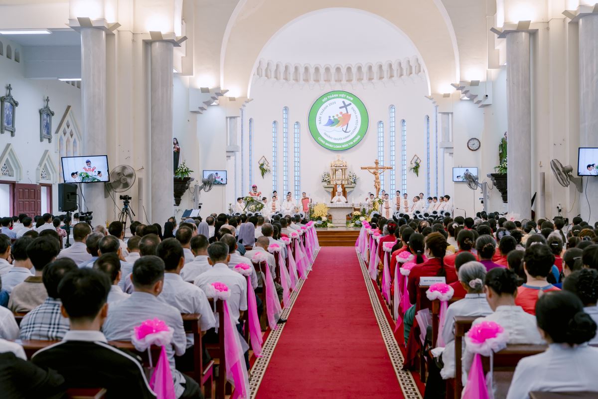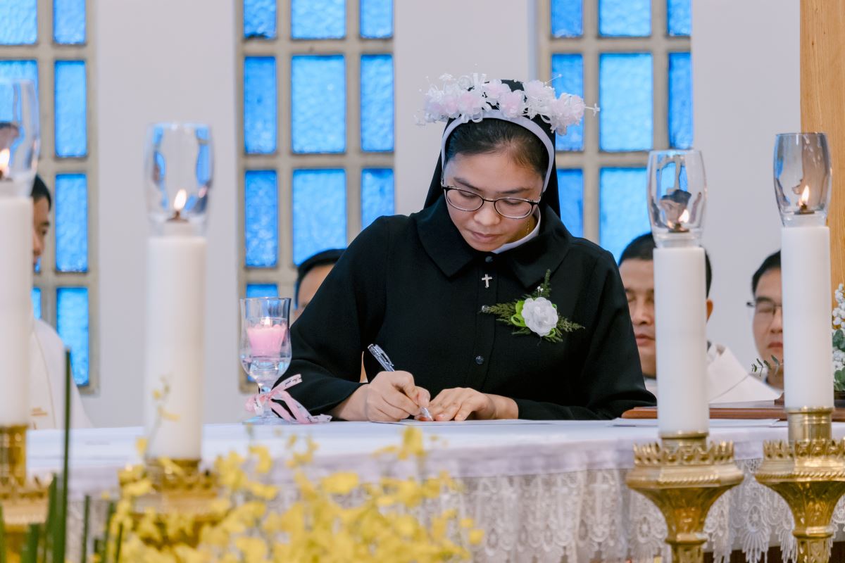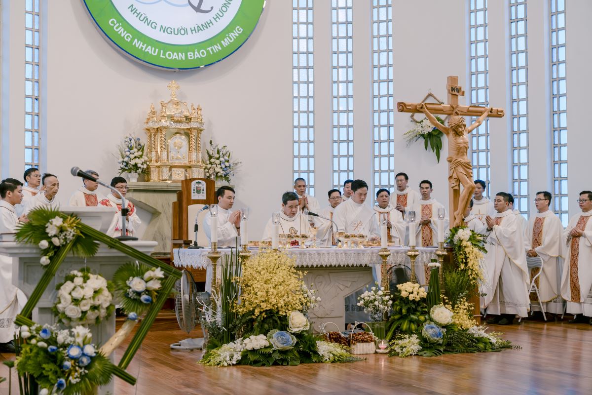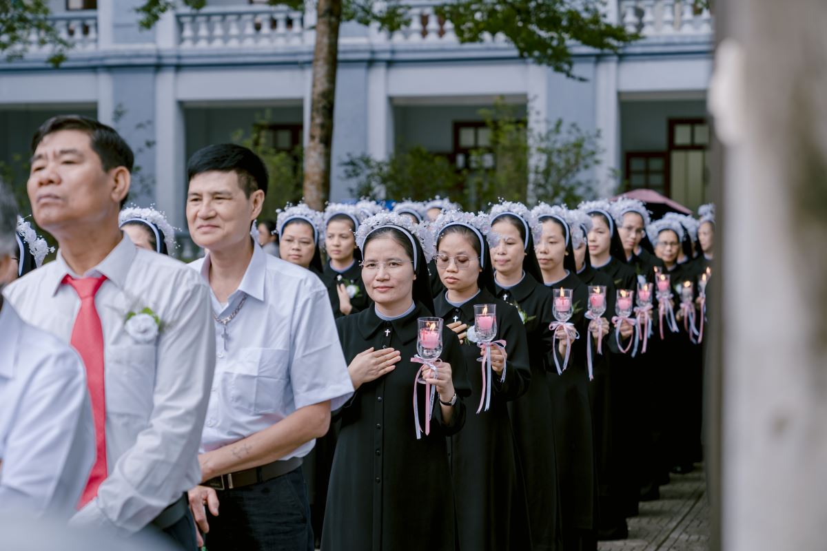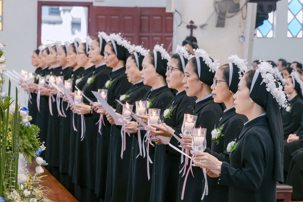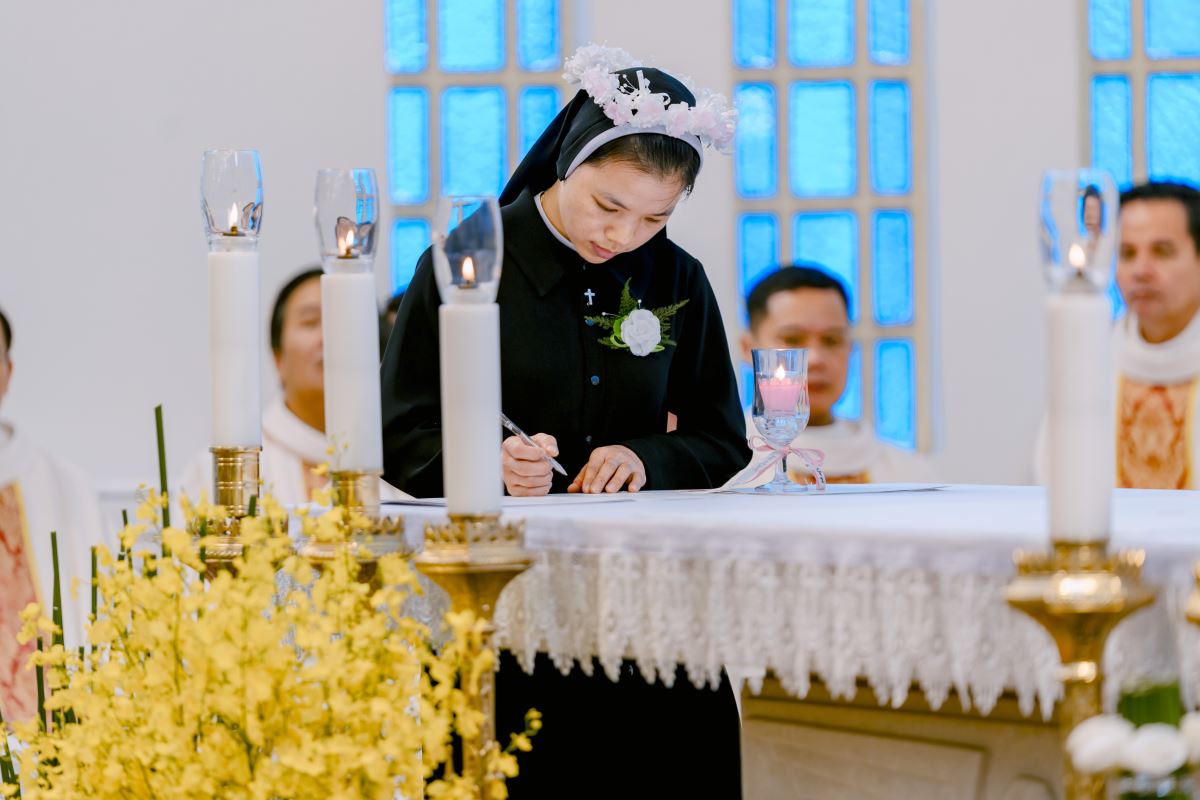 Thánh lễ khép lại trong niềm tạ ơn và hân hoan, khi những bó hoa tươi thắm được trao gửi, những nụ cười rạng rỡ nở trên môi và ánh mắt chan chứa yêu thương của các khấn sinh, gia đình cùng cộng đoàn như hòa quyện trong bản tình ca dâng hiến. Mọi cung bậc cảm xúc đều thấm đẫm ân tình Thiên Chúa, Đấng đã yêu thương, chọn gọi và nâng đỡ các chị trên hành trình thuộc trọn về Ngài. Nguyện xin Đức Trinh Nữ Maria và các Thánh Tử Đạo Việt Nam luôn đổ tràn ân phúc, chở che và nâng đỡ quý dì mừng Ngân khánh khấn dòng cùng các chị vừa tuyên khấn trọn đời, để từng ngày trong hành trình hiến dâng, các chị luôn bình an, trung tín và tràn đầy niềm vui thánh thiện. Ước gì tình yêu Thánh Giá mãi là nguồn suối ngọt lành nuôi dưỡng tâm hồn, để các chị ngày càng kết hiệp mật thiết hơn với Đức Giêsu Kitô Chịu Đóng Đinh – Đấng Tình Quân dịu dàng và trung tín, Đấng mà các chị đã chọn yêu và hiến trọn cả đời mình cho Ngài.