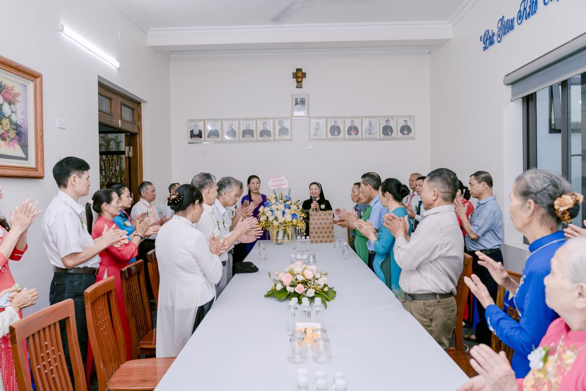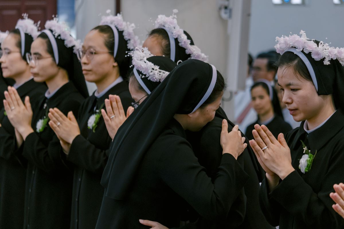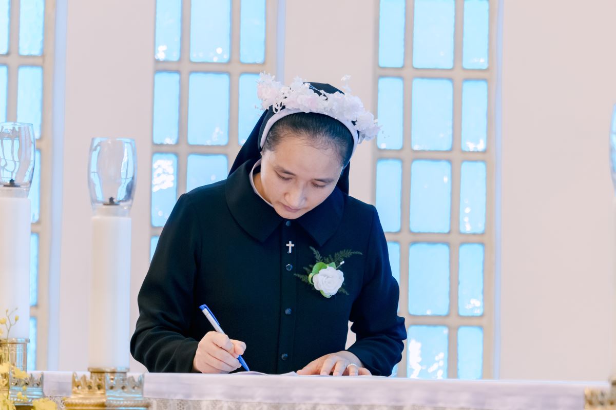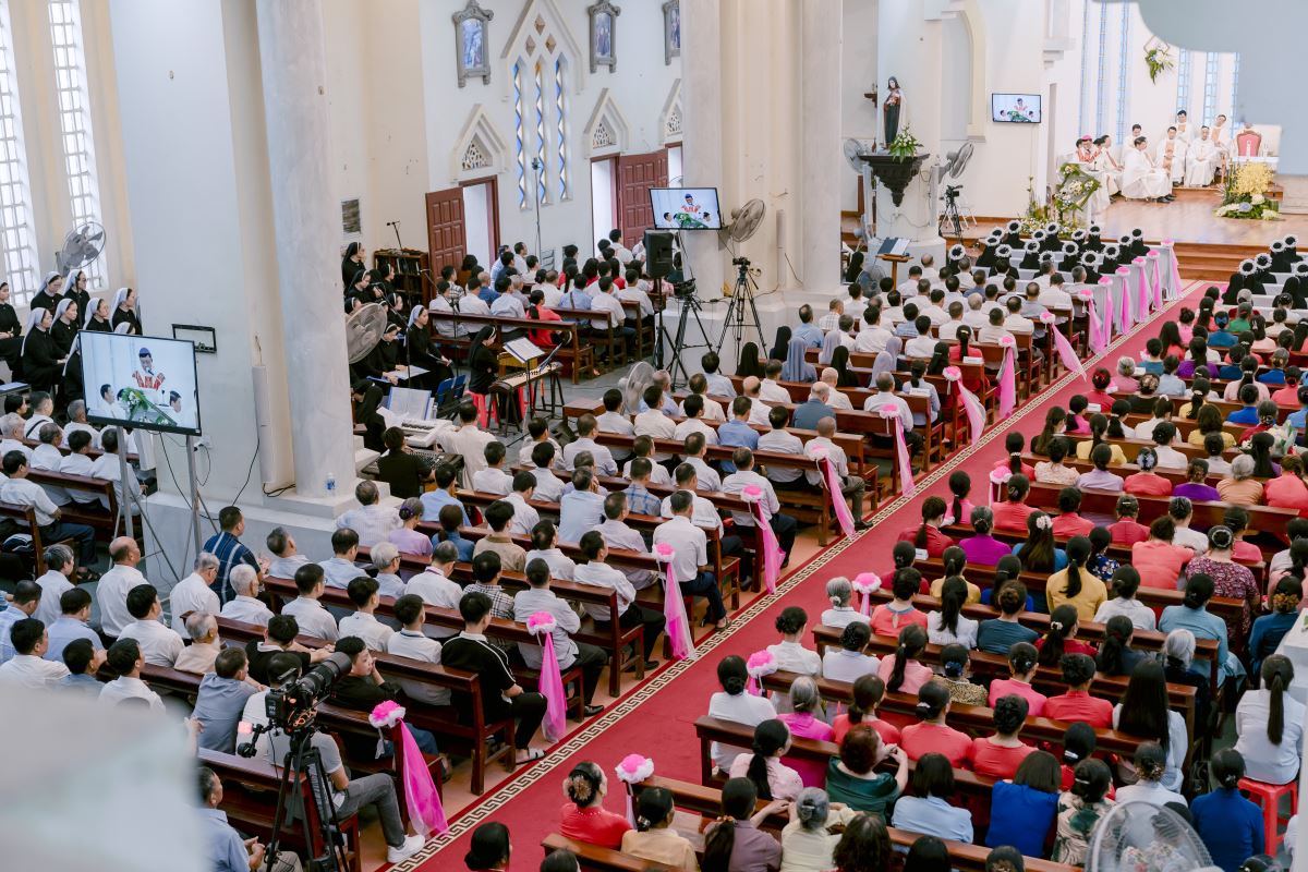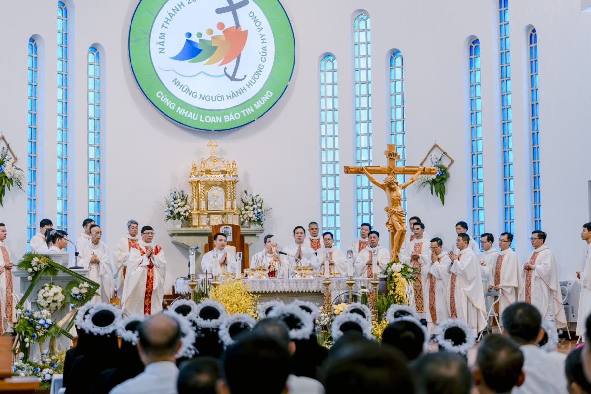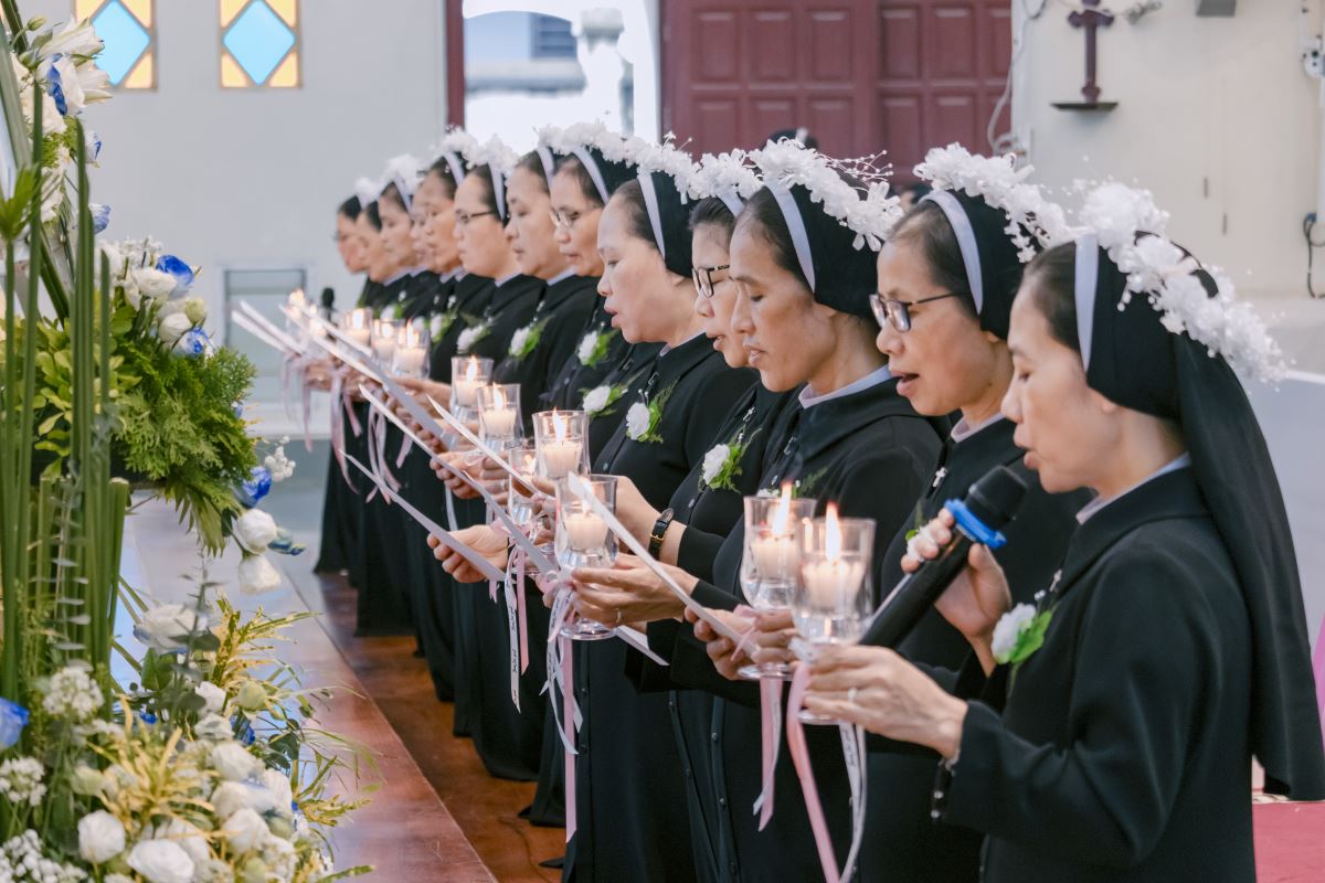 Thánh lễ khép lại trong niềm tạ ơn và hân hoan, khi những bó hoa tươi thắm được trao gửi, những nụ cười rạng rỡ nở trên môi và ánh mắt chan chứa yêu thương của các khấn sinh, gia đình cùng cộng đoàn như hòa quyện trong bản tình ca dâng hiến. Mọi cung bậc cảm xúc đều thấm đẫm ân tình Thiên Chúa, Đấng đã yêu thương, chọn gọi và nâng đỡ các chị trên hành trình thuộc trọn về Ngài. Nguyện xin Đức Trinh Nữ Maria và các Thánh Tử Đạo Việt Nam luôn đổ tràn ân phúc, chở che và nâng đỡ quý dì mừng Ngân khánh khấn dòng cùng các chị vừa tuyên khấn trọn đời, để từng ngày trong hành trình hiến dâng, các chị luôn bình an, trung tín và tràn đầy niềm vui thánh thiện. Ước gì tình yêu Thánh Giá mãi là nguồn suối ngọt lành nuôi dưỡng tâm hồn, để các chị ngày càng kết hiệp mật thiết hơn với Đức Giêsu Kitô Chịu Đóng Đinh – Đấng Tình Quân dịu dàng và trung tín, Đấng mà các chị đã chọn yêu và hiến trọn cả đời mình cho Ngài.