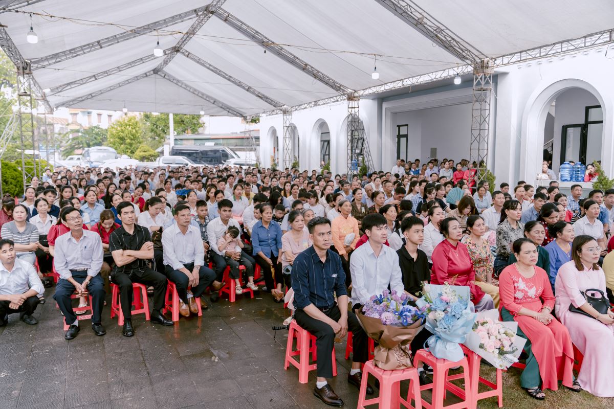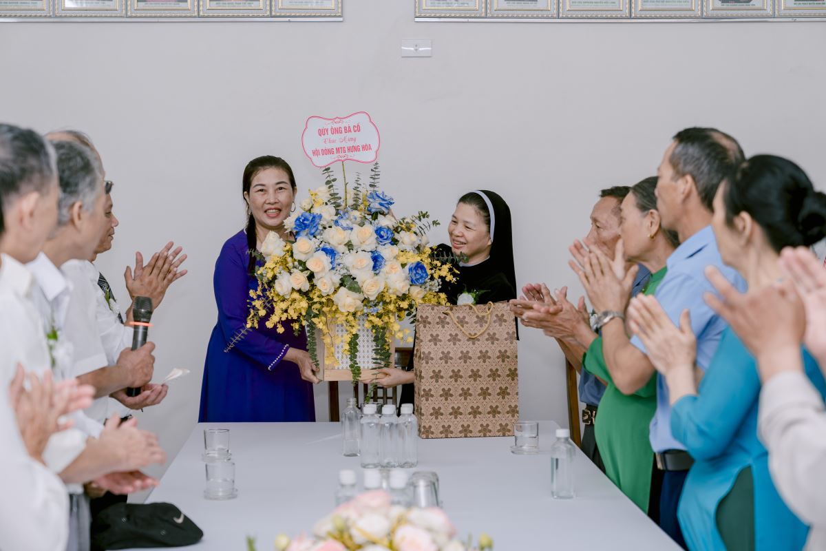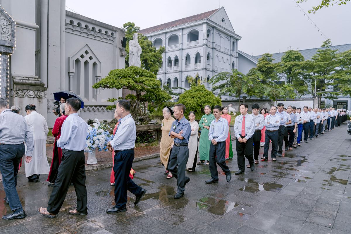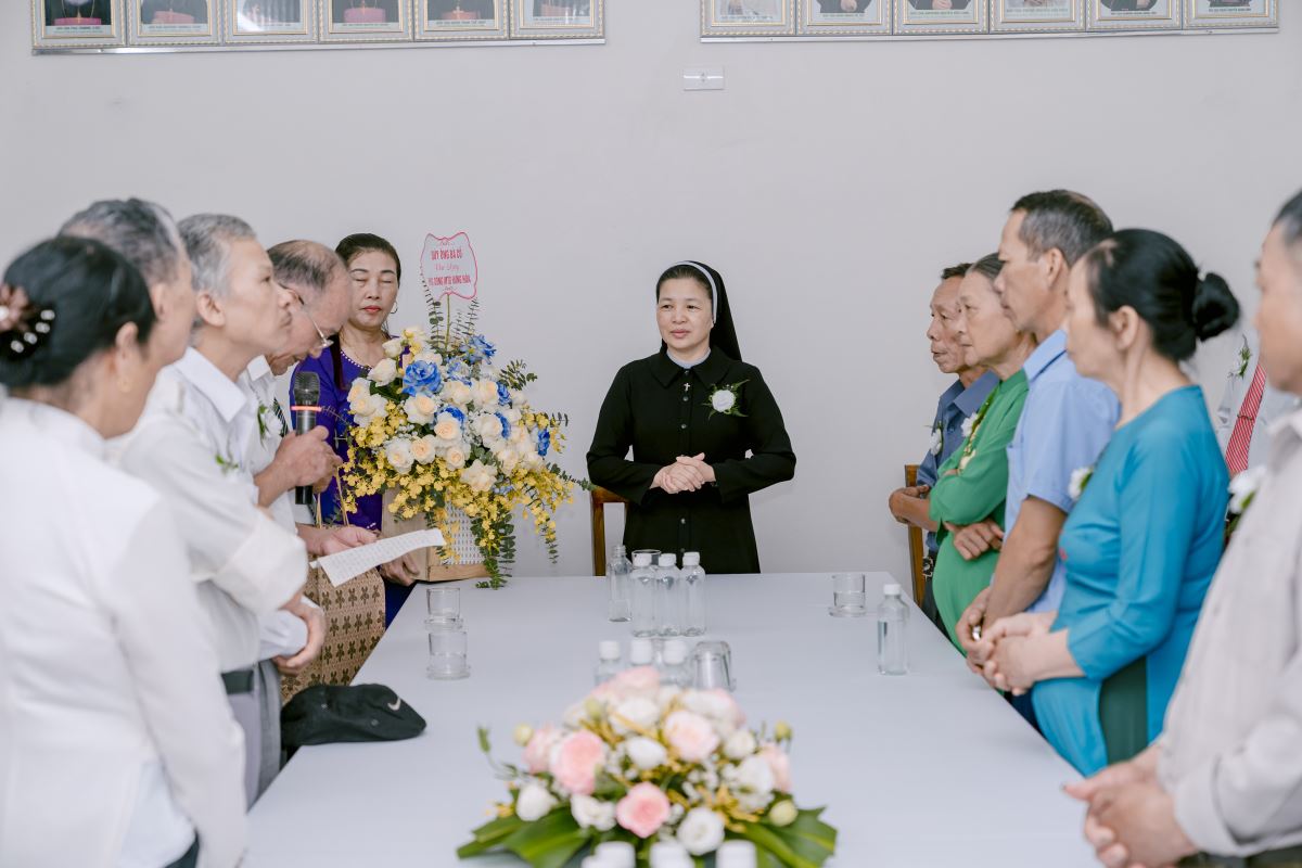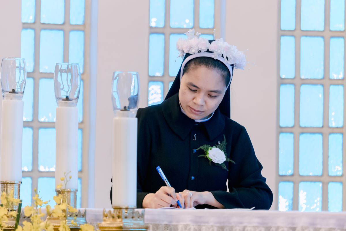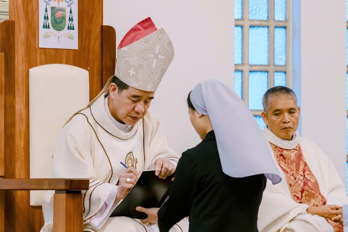 Thánh lễ khép lại trong niềm tạ ơn và hân hoan, khi những bó hoa tươi thắm được trao gửi, những nụ cười rạng rỡ nở trên môi và ánh mắt chan chứa yêu thương của các khấn sinh, gia đình cùng cộng đoàn như hòa quyện trong bản tình ca dâng hiến. Mọi cung bậc cảm xúc đều thấm đẫm ân tình Thiên Chúa, Đấng đã yêu thương, chọn gọi và nâng đỡ các chị trên hành trình thuộc trọn về Ngài. Nguyện xin Đức Trinh Nữ Maria và các Thánh Tử Đạo Việt Nam luôn đổ tràn ân phúc, chở che và nâng đỡ quý dì mừng Ngân khánh khấn dòng cùng các chị vừa tuyên khấn trọn đời, để từng ngày trong hành trình hiến dâng, các chị luôn bình an, trung tín và tràn đầy niềm vui thánh thiện. Ước gì tình yêu Thánh Giá mãi là nguồn suối ngọt lành nuôi dưỡng tâm hồn, để các chị ngày càng kết hiệp mật thiết hơn với Đức Giêsu Kitô Chịu Đóng Đinh – Đấng Tình Quân dịu dàng và trung tín, Đấng mà các chị đã chọn yêu và hiến trọn cả đời mình cho Ngài.
