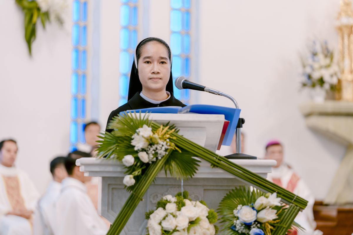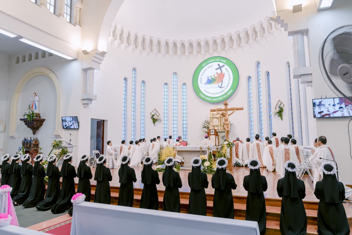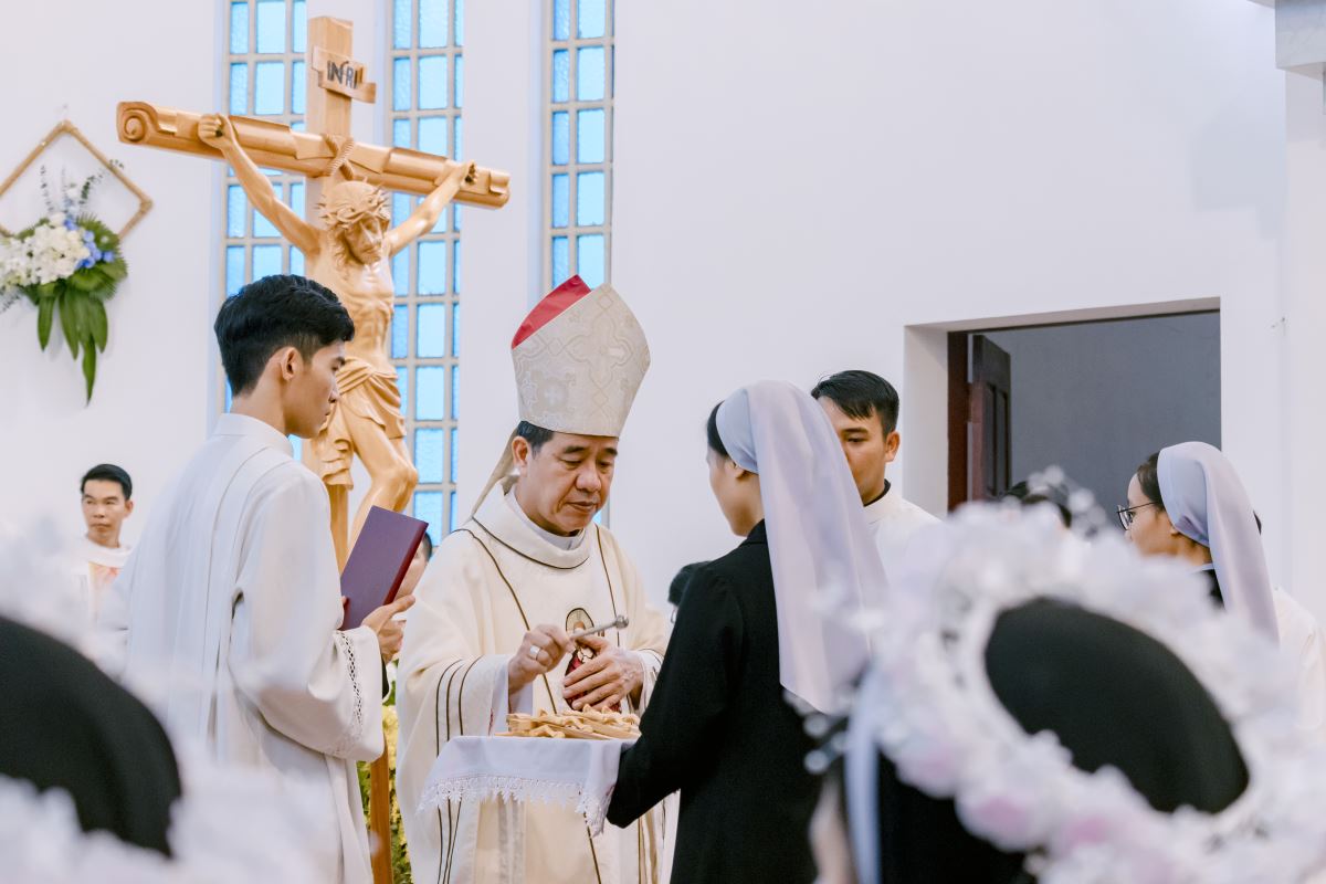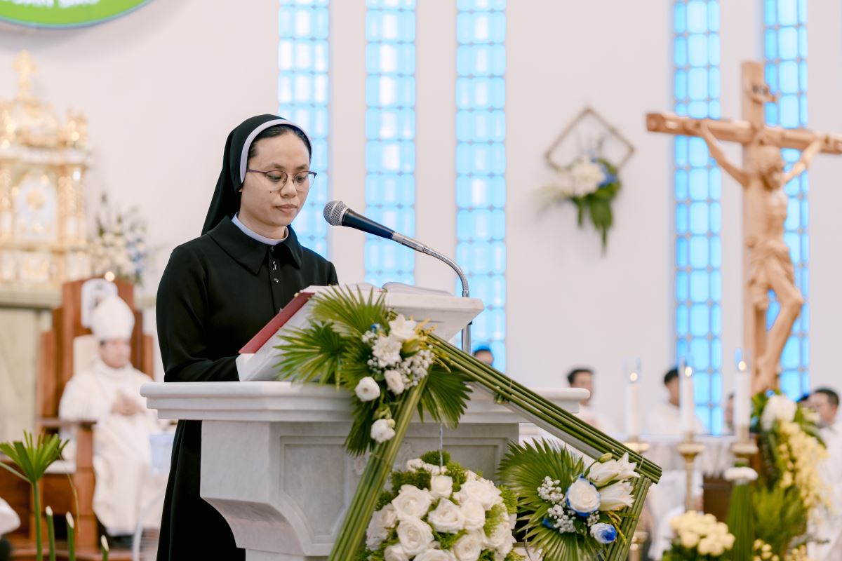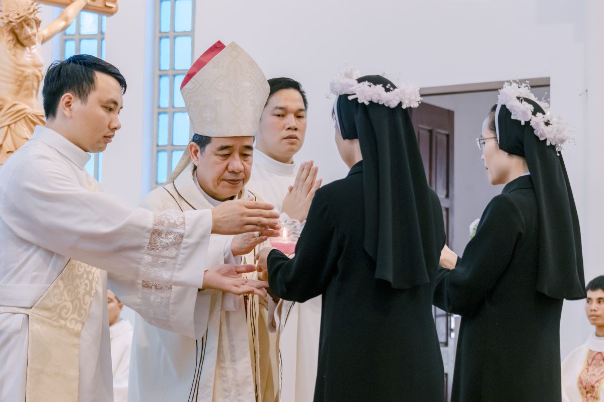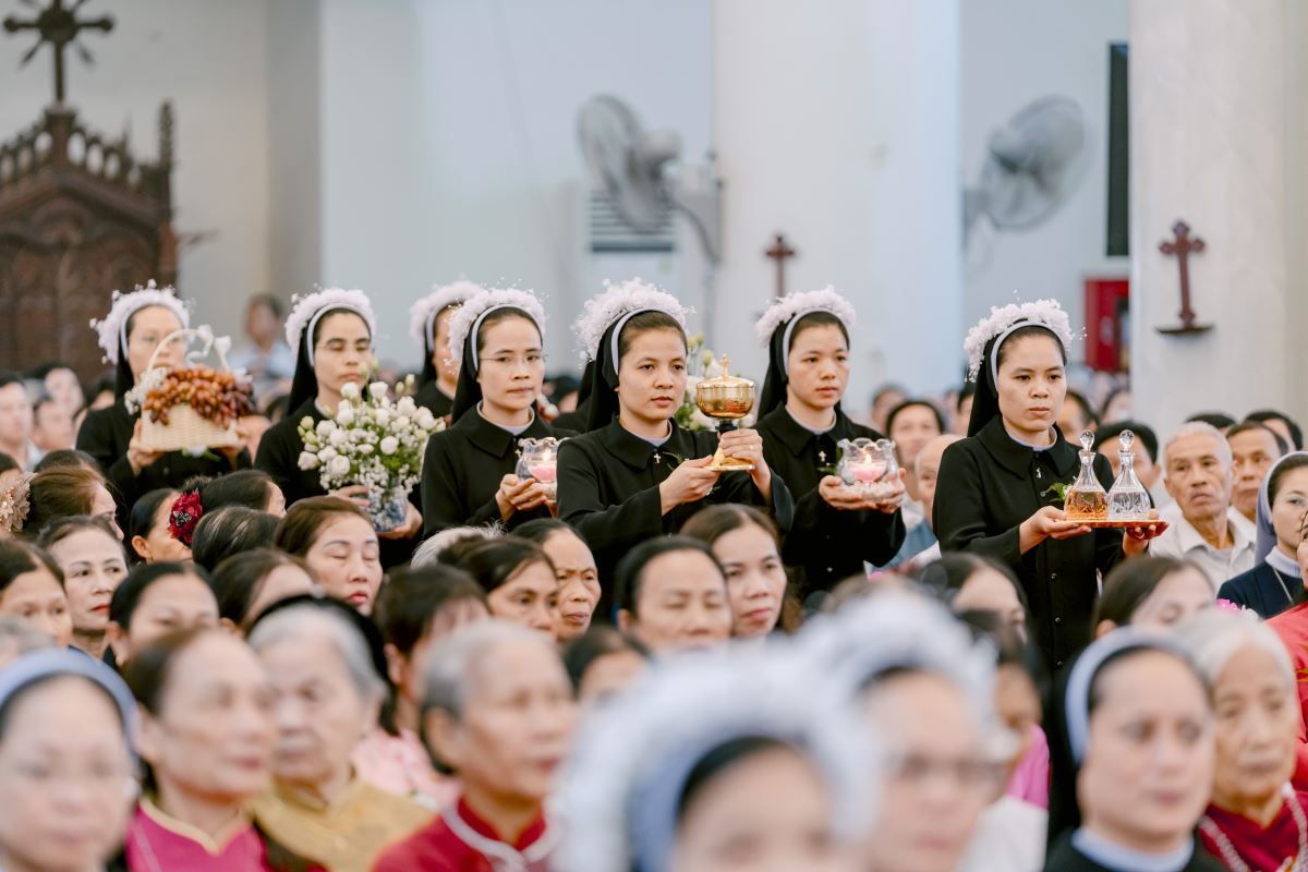 Mở đầu Thánh lễ, Đức cha Đaminh mời gọi cộng đoàn dâng lời tạ ơn Thiên Chúa vì hồng ân Người đã ban cho Giáo phận Hưng Hóa và Hội Dòng có thêm 16 nữ tu tuyên khấn trọn đời và 15 nữ tu mừng Ngân khánh khấn dòng. Đồng thời, Đức cha cũng tha thiết nguyện xin Chúa tuôn đổ muôn phúc lành trên các nữ tu, giúp mỗi chị em luôn sống thánh thiện, đạo đức và trung tín trong đời dâng hiến, để trở nên tấm gương sáng của đời sống tu trì và là chứng nhân sống động cho tình yêu Chúa giữa lòng thế giới hôm nay.