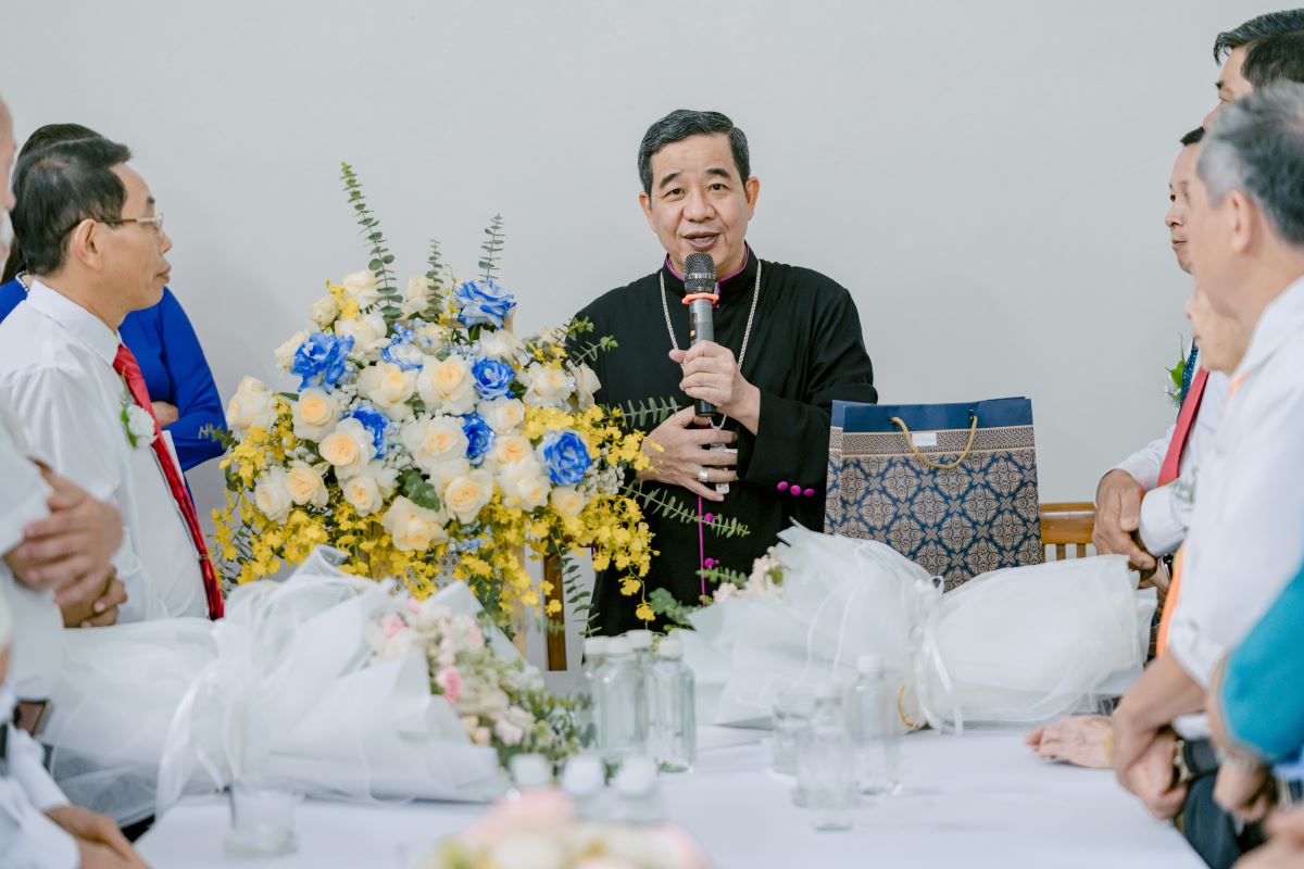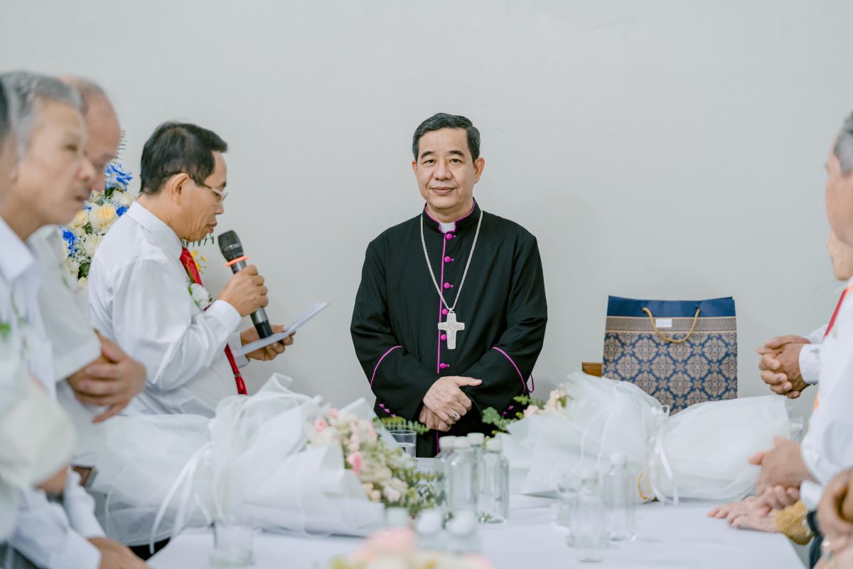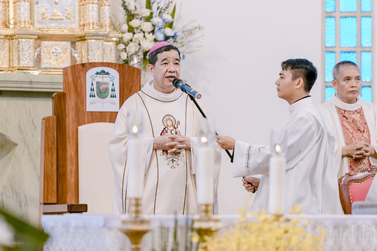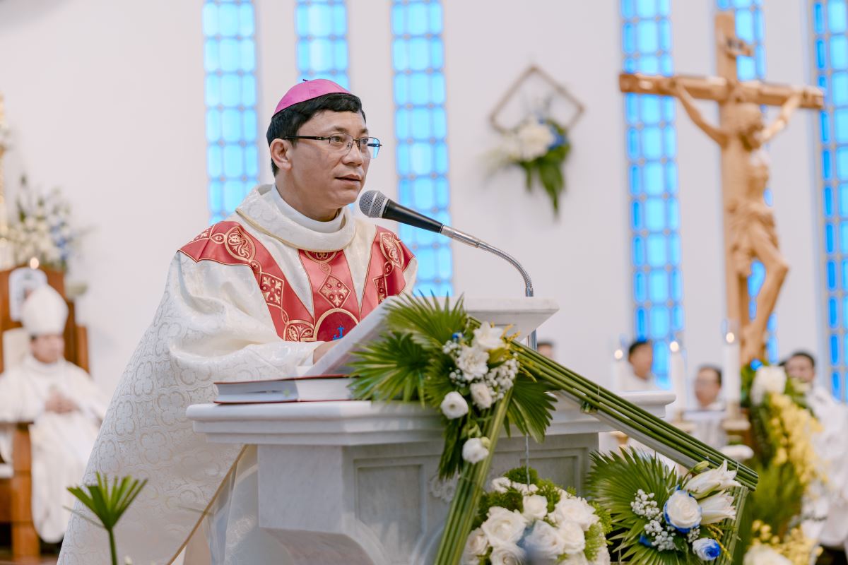 Giảng trong Thánh lễ, Đức cha Phụ tá Phaolô Nguyễn Quang Đĩnh đã chia sẻ với cộng đoàn về mục đích, nền tảng và phương thế trung thành trong đời sống thánh hiến. Đức cha khẳng định, cội nguồn đời thánh hiến là tình yêu tuyển chọn của Thiên Chúa: “Không phải anh em đã chọn Thầy, nhưng chính Thầy đã chọn anh em.” Người được Chúa gọi là người được “đặt riêng ra” để phụng sự Ngài và nên giống Đức Kitô trong mọi sự. Đức cha cũng nhấn mạnh, khi dâng hiến đời mình, các nữ tu đáp lại tình yêu của Thiên Chúa qua việc sống ba lời khuyên Phúc Âm: khiết tịnh, khó nghèo và vâng phục để hoàn toàn thuộc về Chúa, và Chúa chính là phần gia nghiệp và hạnh phúc của đời mình. Để trung thành với hôn ước thiêng liêng, các nữ tu cần gắn bó mật thiết với Chúa như cành nho liền cây nho, qua việc cầu nguyện, suy niệm Lời Chúa và tham dự các cử hành phụng vụ, đặc biệt là Thánh Thể. Đồng thời, trung kiên tuân giữ Hiến chương Hội dòng và luôn nhớ đến chiếc nhẫn khấn dòng như dấu chỉ của tình yêu và lòng trung tín, để không nản lòng trước thử thách và luôn kiên vững bước theo Chúa. Kết thúc, Đức cha không quên cầu chúc các nữ tu mỗi ngày nên giống Chúa hơn, ở lại trong tình yêu của Ngài và sinh nhiều hoa trái thánh thiện trong đời dâng hiến.