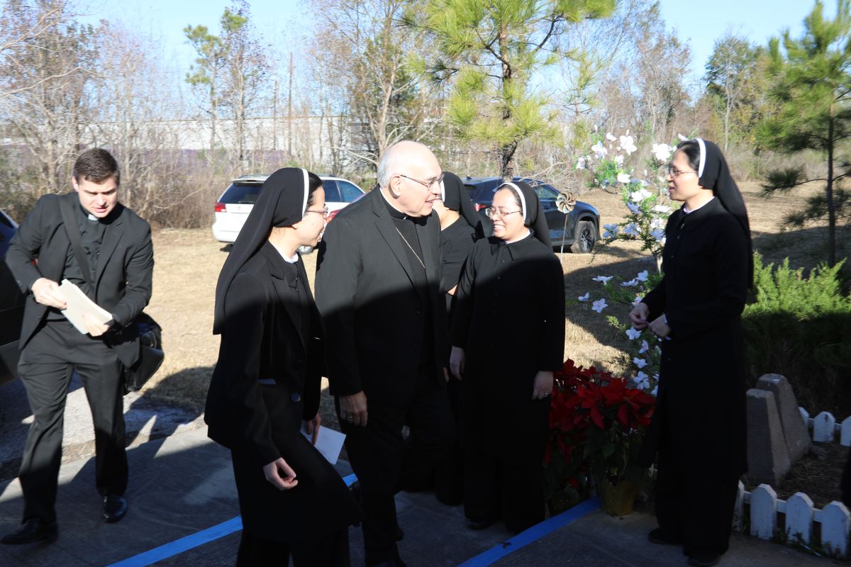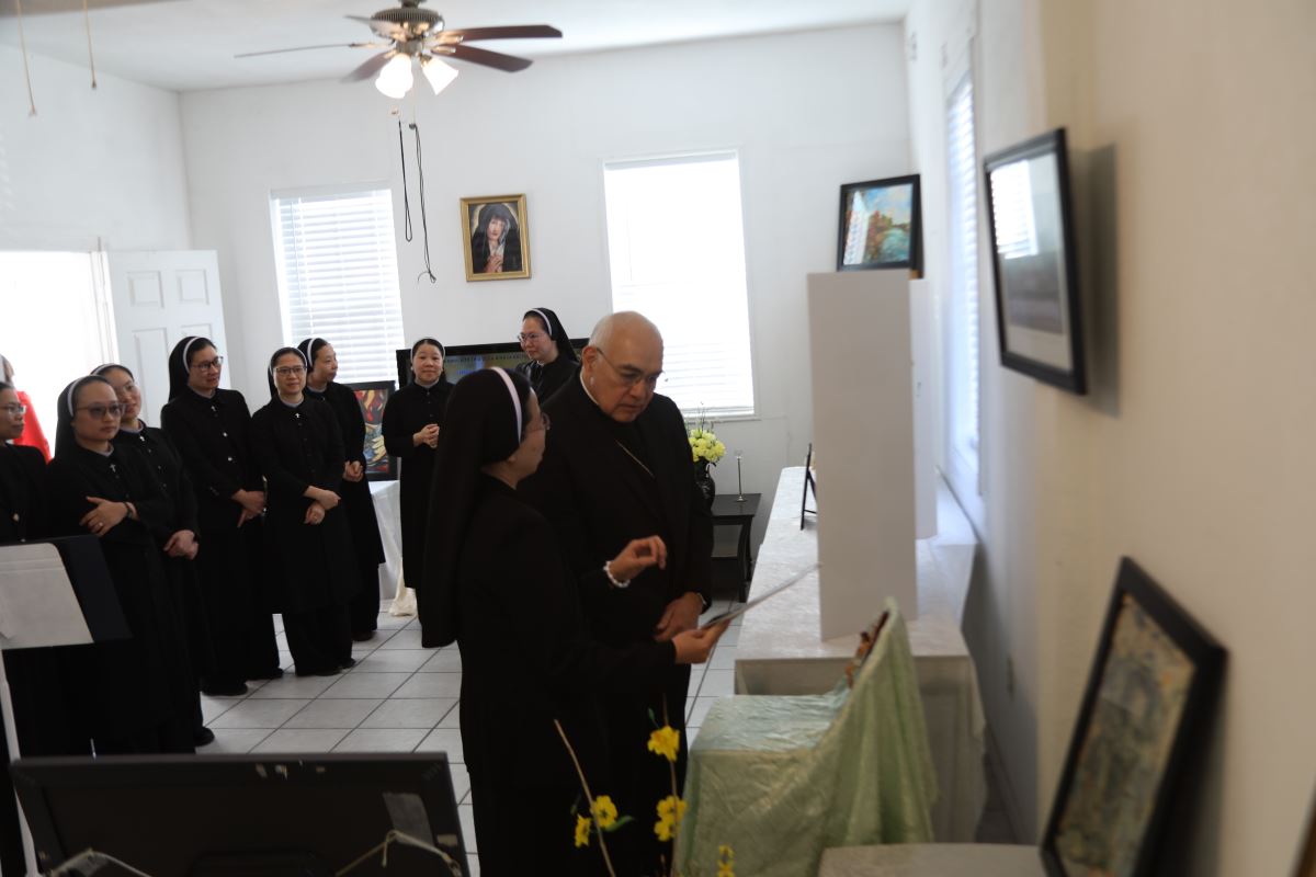 WMTGHH -Trong niềm hân hoan của những ngày đầu Năm Mới 2026, hòa quyện với bầu khí linh thiêng và ấm áp của Mùa Giáng Sinh, vào sáng thứ Bảy, ngày 03 tháng 01 năm 2026, cộng đoàn Dòng Mến Thánh Giá Hưng Hóa tại Houston đã long trọng và vui mừng chào đón Đức Tổng Giám mục Joe S. Vásquez, Tổng Giám mục Tổng Giáo phận Galveston–Houston chủ sự Thánh Lễ làm phép bàn thờ và tu viện mới của Hội Dòng tại thành phố Houston, tiểu bang Texas, Hoa Kỳ. Dù thời gian khá ngắn ngủi để các chị em đang tu học và thi hành sứ vụ tại nhiều tiểu bang khác nhau trên đất Hoa Kỳ quy tụ về và chuẩn bị cho thánh lễ, nhưng với tinh thần hiệp nhất, hy sinh và tín thác vào sự quan phòng của Thiên Chúa, mọi công việc dọn dẹp, sắp xếp và chuẩn bị cho ngày hồng ân này đã được hoàn tất tốt đẹp theo thánh ý Chúa. Lúc 9g30 sáng, chị em trong cộng đoàn đã có giờ gặp gỡ riêng với Đức Tổng Giám Mục Joe S. Vásquez, Tổng Giám mục Tổng Giáo phận Galveston–Houston. Trong bầu khí thân tình và cởi mở, chị em đã chia sẻ với ngài về lịch sử hình thành, linh đạo Mến Thánh Giá, cũng như sứ mạng phục vụ của Hội Dòng tại Việt Nam và tại Hoa Kỳ. Đức Tổng bày tỏ niềm vui và sự khích lệ trước sự hiện diện của Hội Dòng Mến Thánh Giá Hưng Hoá tại Houston, đồng thời ngài đặc biệt ấn tượng trước sức sống trẻ trung và tinh thần dấn thân của cộng đoàn nơi đây.