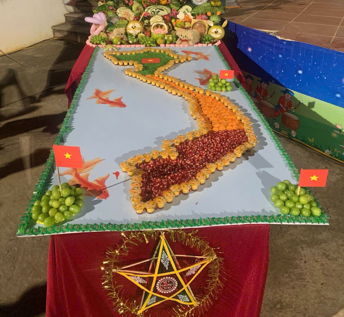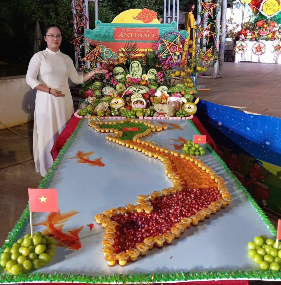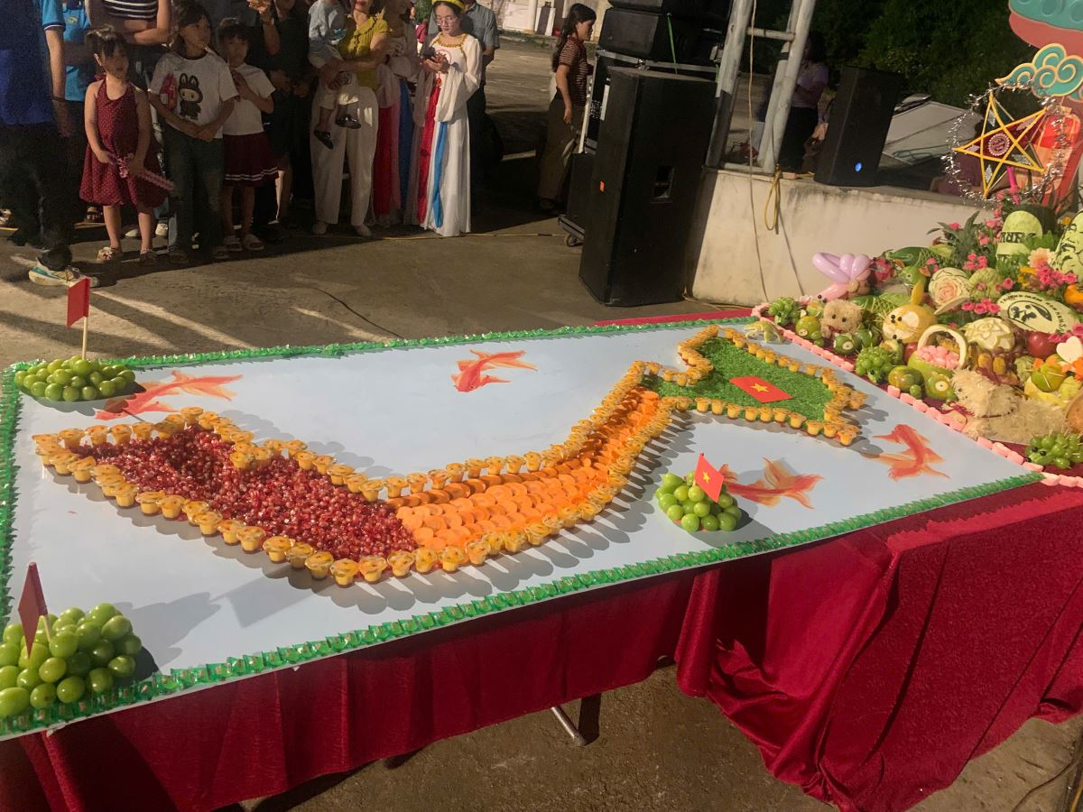 Không chỉ khéo léo trong cách trình bày, các cô giáo cũng là những nữ tu thuộc Hội dòng Mến Thánh Giá Hưng Hóa đã sáng tạo xếp bánh kẹo, hoa quả thành hình bản đồ Việt Nam, nổi bật với những lá cờ được giương cao trên các đảo: Trường Sa, Hoàng Sa và Phú Quốc thể hiện chủ quyền của đất nước Việt Nam. Mâm cỗ không chỉ là một tác phẩm nghệ thuật đầy màu sắc, mà còn truyền tải một thông điệp vô cùng sâu sắc, thể hiện tình yêu quê hương đất nước, lòng tự hào dân tộc và khát vọng chắp cánh ước mơ cho các bé cũng là những chủ nhân tương lai của đất nước, luôn biết yêu Tổ quốc, bảo vệ toàn vẹn chủ quyền đất nước và tự tin vươn mình ra thế giới với trái tim nhân ái. Mâm cỗ ấy đã chạm đến trái tim của những ai có mặt hôm đó, bởi nó không chỉ là sự khéo léo về hình thức, mà là tiếng nói thầm lặng của một sứ mạng lớn lao: truyền giáo bằng tình yêu phục vụ và hiện diện giữa đời thường của các nữ tu Mến Thánh Giá Hưng Hóa.