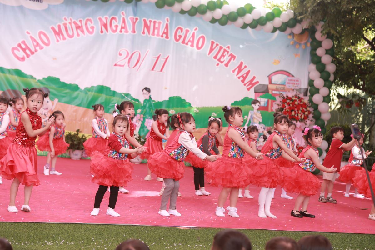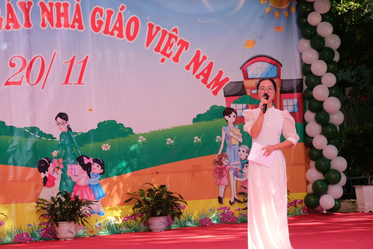 Tiếp nối những cảm xúc đẹp từ triển lãm ảnh, ngày 20/11, nhà trường long trọng tổ chức chương trình chào mừng ngày Nhà Giáo Việt Nam, nhằm tri ân quý thầy cô và tạo sân chơi bổ ích cho các con. Mở đầu chương trình này, cô hiệu trưởng bày tỏ lòng biết ơn sâu sắc đối với sự đồng hành của quý phụ huynh, tinh thần trách nhiệm và nỗ lực không ngừng của tập thể đội ngũ giáo viên trong suốt thời gian qua.