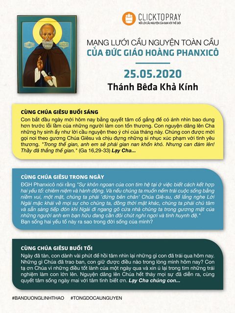 Con bắt đầu ngày mới hôm nay bằng quyết tâm cố gắng để có ánh nhìn bao dung hơn trước lỗi lầm của những người làm con tổn thương. Con nguyện dâng lên Cha những hy sinh ấy như lời cầu nguyện theo ý chỉ của tháng này. Chúng con được mời gọi noi theo gương Chúa Giêsu và chịu đựng những sỉ nhục xúc phạm với tình yêu thương. "Trong thế gian, anh em sẽ phải gian nan khốn khó. Nhưng can đảm lên! Thầy đã thắng thế gian." (Ga 16,29-33) Lạy Cha...