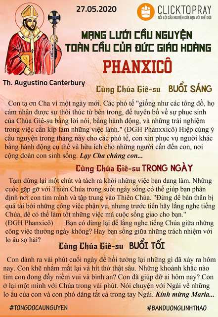 Con tạ ơn Cha vì một ngày mới. Các phó tế "giống như các tông đồ, họ cảm nhận được sự thôi thúc từ bên trong, để tuyên bố về sự phục sinh của Chúa Giê-su bằng lời nói, bằng hành động, và những trải nghiệm trong việc cần kíp làm những việc lành." (ĐGH Phanxxicô) Hiệp cùng ý cầu nguyện trong tháng này cho các phó tế, con xin phục vụ người khác bằng hành động cụ thể và hữu ích cho những người cần đến con, nơi cộng đoàn con sinh sống. Lạy Cha chúng con...