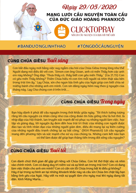 Con bắt đầu ngày mới bằng việc suy ngẫm câu hỏi của Chúa Giêsu trong lòng như thể Người đang nói điều đó với con. 'Simon con ông Gioan, anh có mến Thầy hơn các anh em này không? Ông đáp: "Thưa thầy có, thầy biết con yêu mến Thầy." (Ga 21,15) Con có yêu mến Thầy không? Thiên Chúa hiểu rõ con tim mỗi người và nhìn thật sâu bên trong trái tim ấy." Lạy Chúa, xin cho ngọn lửa tình yêu của Ngài giúp con biết chia sẻ miếng bánh cho những anh em mình. Con xin dâng ngày hôm nay theo ý nguyện của tháng này. Lạy Cha chúng con ở trên trời....