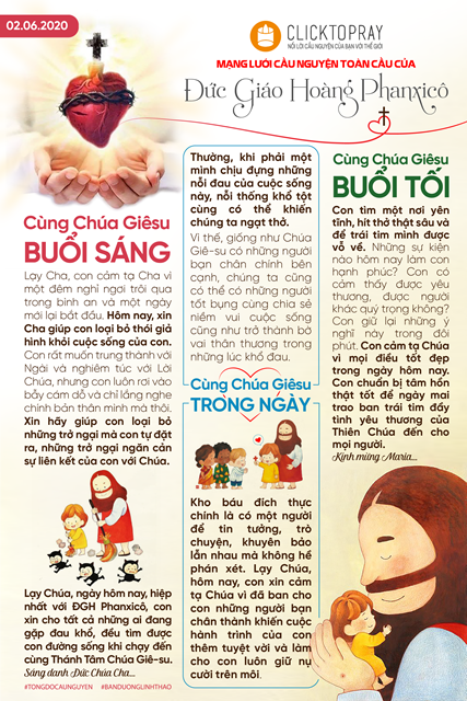 Lạy Cha, con cảm tạ Cha vì một đêm nghỉ ngơi trôi qua trong bình an và một ngày mới lại bắt đầu. Hôm nay, xin Cha giúp con loại bỏ thói giả hình khỏi cuộc sống của con. Con rất muốn trung thành với Ngài và nghiêm túc với Lời Chúa, nhưng con luôn rơi vào bẫy cám dỗ và chỉ lắng nghe chính bản thân mình mà thôi. Xin hãy giúp con loại bỏ những trở ngại mà con tự đặt ra, những trở ngại ngăn cản sự liên kết của con với Chúa. Lạy Chúa, ngày hôm nay, hiệp nhất với ĐGH Phanxicô, con xin cho tất cả những ai đang gặp đau khổ, đều tìm được con đường sống khi chạy đến cùng Thánh Tâm Chúa Giê-su. Sáng danh Đức Chúa Cha…