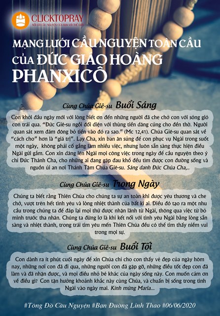 Lạy Cha, xin ban ân sủng để con phục vụ Ngài trong suốt một ngày, không phải cố gắng làm nhiều việc, nhưng luôn sẵn sàng thực hiện điều Ngài gửi gắm. Con xin dâng lên Ngài mọi công việc trong ngày để cầu nguyện theo ý chỉ Đức Thánh Cha, cho những ai đang gặp đau khổ đều tìm được con đường sống và nguồn ủi an nơi Thánh Tâm Chúa Giê-su. Sáng danh Đức Chúa Cha,..