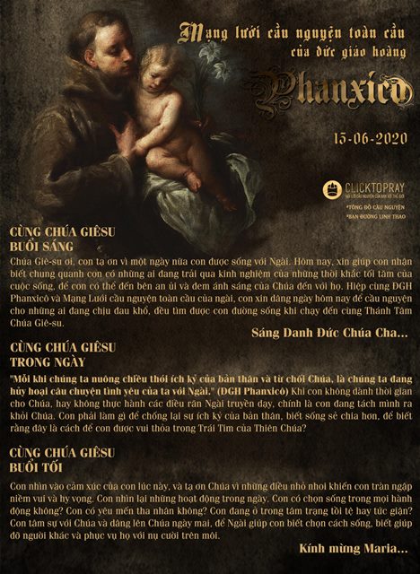 Chúa Giê-su ơi, con tạ ơn vì một ngày nữa con được sống với Ngài. Hôm nay, xin giúp con nhận biết chung quanh con có những ai đang trải qua kinh nghiệm của những thời khắc tối tăm của cuộc sống, để con có thể đến bên an ủi và đem ánh sáng của Chúa đến với họ. Hiệp cùng ĐGH Phanxicô và Mạng Lưới cầu nguyện toàn cầu của ngài, con xin dâng ngày hôm nay để cầu nguyện cho những ai đang chịu đau khổ, đều tìm được con đường sống khi chạy đến cùng Thánh Tâm Chúa Giê-su. Sáng Danh Đức Chúa Cha...