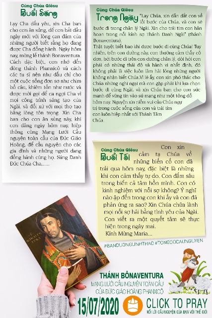 Lạy Cha dấu yêu, xin Cha ban cho con ân sủng, để con bắt đầu ngày mới với lòng can đảm của những người biết rằng họ đang được Cha đồng hành. Ngày hôm nay, mừng lễ thánh Bonaventura. Cách đặc biệt, con nhớ đến dòng thánh Phanxicô và cách các tu sĩ nên như dấu chỉ cho một cuộc sống đơn sơ như chim bồ câu, khiêm tốn như nước và được mời gọi để ca ngợi Cha vì mọi công trình sáng tạo của Ngài, và đối xử với mọi thọ tạo bằng lòng tôn trọng. Xin Cha ban cho con ân sủng này, khi con dâng ngày hôm nay, hiệp thông cùng Mạng Lưới Cầu nguyện toàn cầu của Đức Giáo Hoàng, để cầu nguyện cho các gia đình và những người đang đồng hành cùng họ. Sáng Danh Đức Chúa Cha,.....