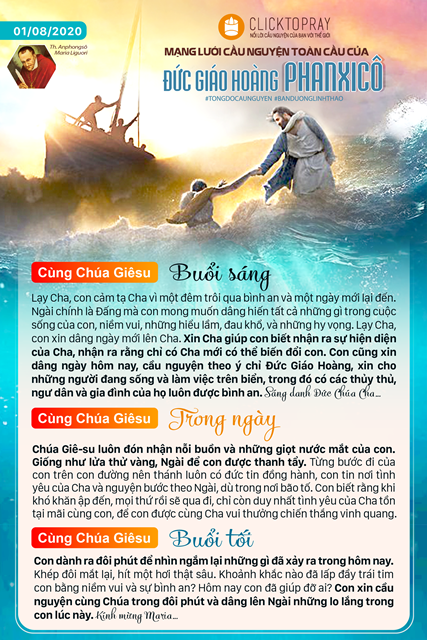 Lạy Cha, con cảm tạ Cha vì một đêm trôi qua bình an và một ngày mới lại đến. Ngài chính là Đấng mà con mong muốn dâng hiến tất cả những gì trong cuộc sống của con, niềm vui, những hiểu lầm, đau khổ, và những hy vọng. Lạy Cha, con xin dâng ngày mới lên Cha. Xin Cha giúp con biết nhận ra sự hiện diện của Cha, nhận ra rằng chỉ có Cha mới có thể biến đổi con. Con cũng xin dâng ngày hôm nay, cầu nguyện theo ý chỉ Đức Giáo Hoàng, xin cho những người đang sống và làm việc trên biển, trong đó có các thủy thủ, ngư dân và gia đình của họ luôn được bình an. Sáng danh Đức Chúa Cha…