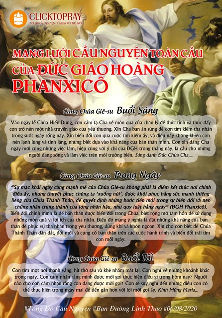 Vào ngày lễ Chúa Hiển Dung, con cảm tạ Cha về món quà của chân lý để thức tỉnh và thúc đẩy con trở nên một nhà truyền giáo của yêu thương. Xin Cha ban ân sủng để con tìm kiếm tha nhân trong suốt ngày sống này. Xin biến đổi con qua cuộc tìm kiếm ấy, và điều này không khiến con nên lạnh lùng và tĩnh lặng, nhưng biết dựa vào khả năng của bản thân mình. Con xin dâng Cha ngày mới cùng những việc làm, hiệp cùng với ý chỉ của ĐGH trong tháng này, là cầu cho những người đang sống và làm việc trên môi trường biển. Sáng danh Đức Chúa Cha,…