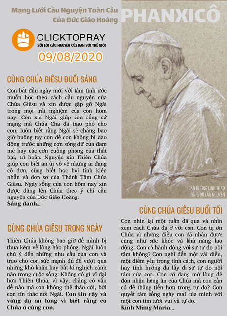 Con bắt đầu ngày mới với tâm tình ước muốn học theo cách cầu nguyện của Chúa Giêsu và xin được gặp gỡ Ngài trong mọi trải nghiệm của con hôm nay. Con xin Ngài giúp con sống sứ mạng mà Chúa Cha đã trao phó cho con, luôn biết rằng Ngài sẽ chẳng bao giờ buông tay con để con không bị dao động trước những cơn sóng dữ của đam mê hay các cơn cuồng phong của thất bại, trì hoãn. Nguyện xin Thiên Chúa giúp con biết an ủi vỗ về những ai đang cô đơn, cùng biết học hỏi tính kiên nhẫn và đơn sơ của Thánh Tâm Chúa Giêsu. Ngày sống của con hôm nay xin được dâng lên Chúa theo ý chỉ cầu nguyện của Đức Giáo Hoàng. Sáng danh...