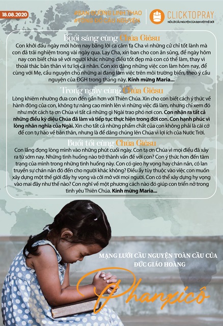 Con khởi đầy ngày mới hôm nay bằng lời ca cảm tạ Cha vì những cử chỉ tốt lành mà con đã trải nghiệm trong vài ngày qua. Lạy Cha, xin ban cho con ân sủng, để ngày hôm nay con biết chia sẻ với người khác những điều tốt đẹp mà con có thể làm, thay vì thoái thác bản thân vì tư lợi cá nhân. Con xin dâng những việc con làm hôm nay, để cùng với Mẹ, cầu nguyện cho những ai đang làm việc trên môi trường biển, theo ý cầu nguyện của ĐGH trong tháng này. Kính mừng Maria...