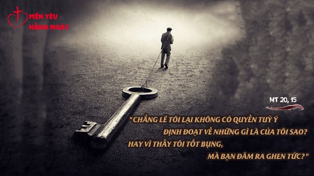 Câu này được trích từ dụ ngôn ông chủ vườn nho thuê các nhóm thợ ở năm thời điểm khác nhau trong ngày. Nhóm đầu tiên được thuê vào lúc hừng đông, nhóm hai vào lúc 9 giờ sáng, nhóm thứ ba vào giữa trưa, và lần lượt hai nhóm còn lại lúc 3 giờ và 5 giờ chiều. Những người thợ được thuê vào lúc sáng sớm phải làm khoảng 12 tiếng trong khi nhóm thợ được gọi lúc 5 giờ chiều chỉ làm vỏn vẹn 1 tiếng đồng hồ. Vấn đề là ông chủ lại trả công cho tất cả mọi người mức lương bằng nhau. Chính điều này đã khiến cho nhóm thợ làm nhiều giờ phải ghen tức. Chắc hẳn chúng ta có thể hiểu được nỗi ghen tức của những người thợ làm việc cả ngày khi đặt mình vào trường hợp của họ. Họ làm đủ 12 tiếng và được trả công đúng theo thỏa thuận từ sáng sớm. Nhưng họ ghen tức vì những người khác chỉ làm 1 tiếng mà được ông chủ hào phóng trả công bằng mức lương của một ngày.