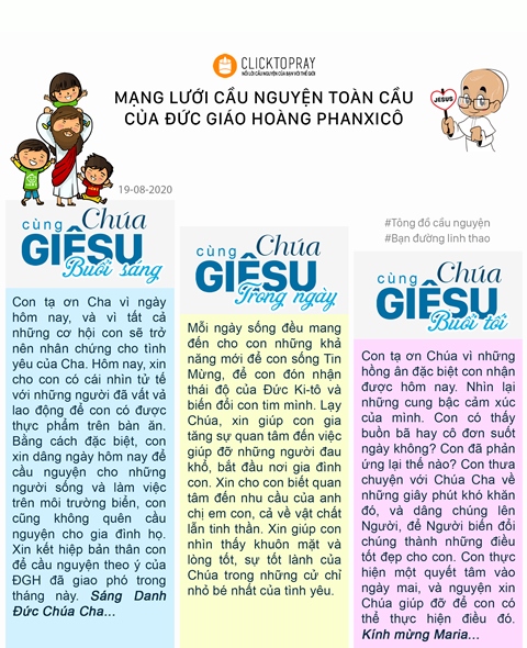Con tạ ơn Cha vì ngày hôm nay, và vì tất cả những cơ hội con sẽ trở nên nhân chứng cho tình yêu của Cha. Hôm nay, xin cho con có cái nhìn tử tế với những người đã vất vả lao động để con có được thực phẩm trên bàn ăn. Bằng cách đặc biệt, con xin dâng ngày hôm nay để cầu nguyện cho những người sống và làm việc trên môi trường biển, con cũng không quên cầu nguyện cho gia đình họ. Xin kết hiệp bản thân con để cầu nguyện theo ý của ĐGH đã giao phó trong tháng này. Sáng Danh Đức Chúa Cha...