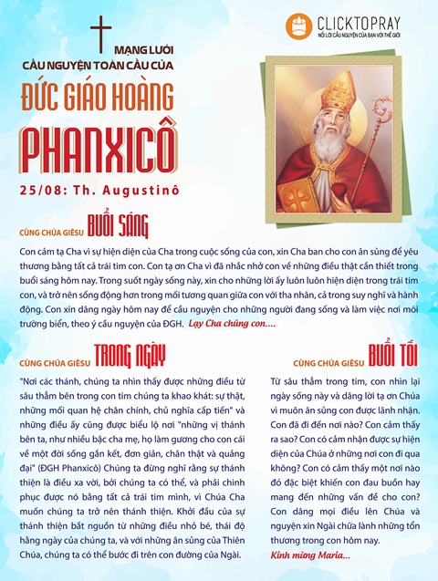 Con cảm tạ Cha vì sự hiện diện của Cha trong cuộc sống của con, xin Cha ban cho con ân sủng để yêu thương bằng tất cả trái tim con. Con tạ ơn Cha vì đã nhắc nhở con về những điều thật cần thiết trong buổi sáng hôm nay. Trong suốt ngày sống này, xin cho những lời ấy luôn luôn hiện diện trong trái tim con, và trở nên sống động hơn trong mối tương quan giữa con với tha nhân, cả trong suy nghĩ và hành động. Con xin dâng ngày hôm nay để cầu nguyện cho những người đang sống và làm việc nơi môi trường biển, theo ý cầu nguyện của ĐGH. Lạy Cha chúng con...