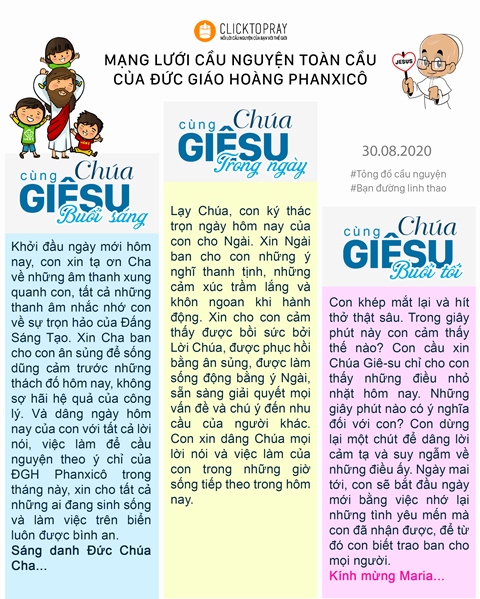 Khởi đầu ngày mới hôm nay, con xin tạ ơn Cha về những âm thanh xung quanh con, tất cả những thanh âm nhắc nhớ con về sự trọn hảo của Đấng Sáng Tạo. Xin Cha ban cho con ân sủng để sống dũng cảm trước những thách đố hôm nay, không sợ hãi hệ quả của công lý. Và dâng ngày hôm nay của con với tất cả lời nói, việc làm để cầu nguyện theo ý chỉ của ĐGH Phanxicô trong tháng này, xin cho tất cả những ai đang sinh sống và làm việc trên biển luôn được bình an. Sáng danh Đức Chúa Cha...