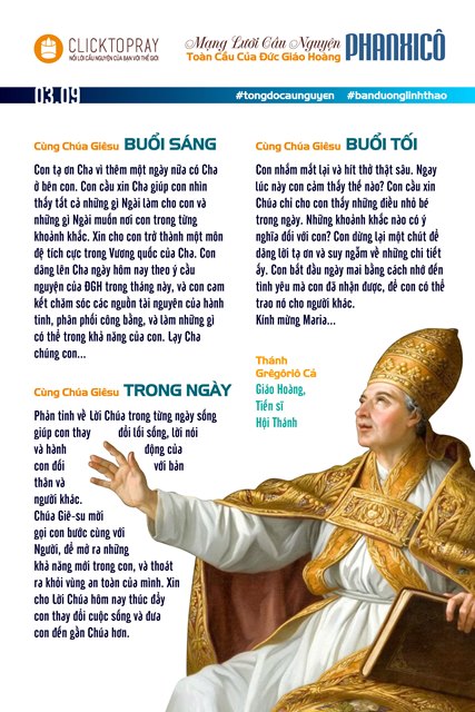 Con tạ ơn Cha vì thêm một ngày nữa có Cha ở bên con. Con cầu xin Cha giúp con nhìn thấy tất cả những gì Ngài làm cho con và những gì Ngài muốn nơi con trong từng khoảnh khắc. Xin cho con trở thành một môn đệ tích cực trong Vương quốc của Cha. Con dâng lên Cha ngày hôm nay theo ý cầu nguyện của ĐGH trong tháng này, và con cam kết chăm sóc các nguồn tài nguyên của hành tinh, phân phối công bằng, và làm những gì có thể trong khả năng của con. Lạy Cha chúng con...