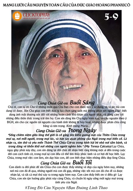 "Sống chiêm niệm giữa lòng thế giới là cố gắng tìm kiếm gương mặt của Thiên Chúa trong mọi sự, nơi mỗi người, trong mọi lúc, và bàn tay quan phòng của Ngài trong mọi biến cố. Là nhận ra, tôn thờ và yêu mến Thánh Thể Chúa Giê-su trong hình hài bé nhỏ nơi tấm bánh, và trong dáng vẻ khốn khổ nơi những con người nghèo hèn." (Mẹ Teresa Calcutta) Lạy Chúa, ngay giây phút này đây, con xin dừng lại đôi chút để nhận biết rằng không một ai đến trong cuộc đời con cách tình cờ, trong mọi sự con đều có thể tìm thấy phúc lành và cơ hội để học biết. Lạy Chúa, trong mọi việc con làm, xin dạy bảo con, để con biết thực hiện những điều đẹp lòng Chúa.