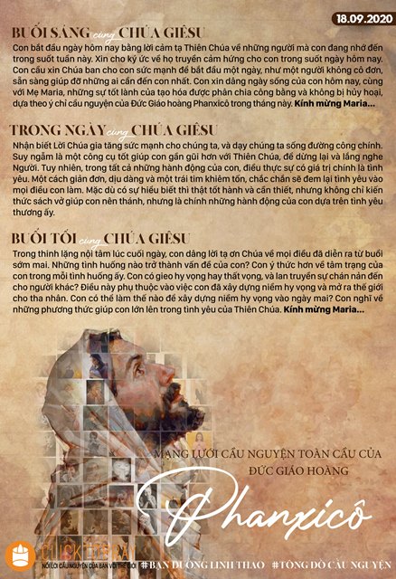 Con bắt đầu ngày hôm nay bằng lời cảm tạ Thiên Chúa về những người mà con đang nhớ đến trong suốt tuần này. Xin cho ký ức về họ truyền cảm hứng cho con trong suốt ngày hôm nay. Con cầu xin Chúa ban cho con sức mạnh để bắt đầu một ngày, như một người không cô đơn, sẵn sàng giúp đỡ những ai cần đến con nhất. Con xin dâng ngày sống của con hôm nay, cùng với Mẹ Maria, những sự tốt lành của tạo hóa được phân chia công bằng và không bị hủy hoại, dựa theo ý chỉ cầu nguyện của Đức Giáo hoàng Phanxicô trong tháng này. Kính mừng....
