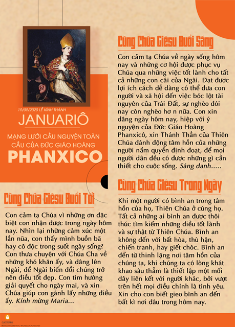 Con cảm tạ Chúa về ngày sống hôm nay và những cơ hội được phục vụ Chúa qua những việc tốt lành cho tất cả những con cái của Ngài. Đạt được lợi ích cách dễ dàng có thể đưa con người và xã hội đến việc bóc lột tài nguyên của Trái Đất, sự nghèo đói nay còn nghèo hơn nữa. Con xin dâng ngày hôm nay, hiệp với ý nguyện của Đức Giáo Hoàng Phanxicô, xin Thánh Thần của Thiên Chúa đánh động tâm hồn của những người nắm quyền định đoạt, để mọi người dân đều có được những gì cần thiết cho cuộc sống. Sáng danh.....