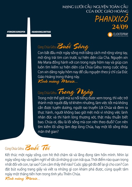 Con bắt đầu một ngày sống mới bằng cách mở rộng vòng tay, mở rộng trái tim con trước sự hiện diện của Cha. Nguyện xin Mẹ Maria đồng hành với con trong ngày hôm nay và giúp con luôn tìm kiếm sự hiện diện của Chúa Giêsu trong cuộc sống. Con xin dâng ngày hôm nay để cầu nguyện theo ý chỉ của Đức Giáo Hoàng trong tháng này. Kính mừng Maria...