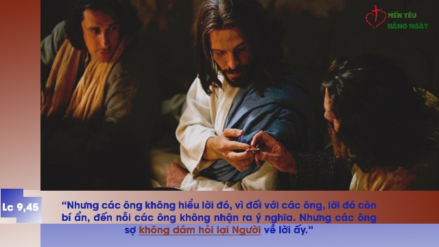 Đức Giê-su kêu gọi các môn đệ chú ý lắng nghe kỹ lời Ngài sắp nói. Và rồi Ngài bắt đầu giải thích về cuộc khổ nạn và cái chết Ngài sắp phải trải qua, nhưng các ông không nhận ra ý nghĩa lời Ngài và họ sợ không dám hỏi lại về lời ấy.
