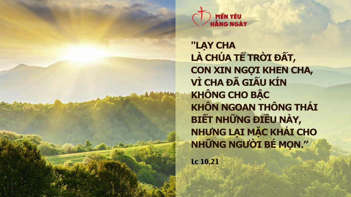 Ngay giờ ấy, được Thánh Thần tác động, Đức Giê-su hớn hở vui mừng và nói: "Lạy Cha là Chúa Tể trời đất, con xin ngợi khen Cha, vì Cha đã giấu kín không cho bậc khôn ngoan thông thái biết những điều này, nhưng lại mặc khải cho những người bé mọn. Vâng, lạy Cha, vì đó là điều đẹp ý Cha.