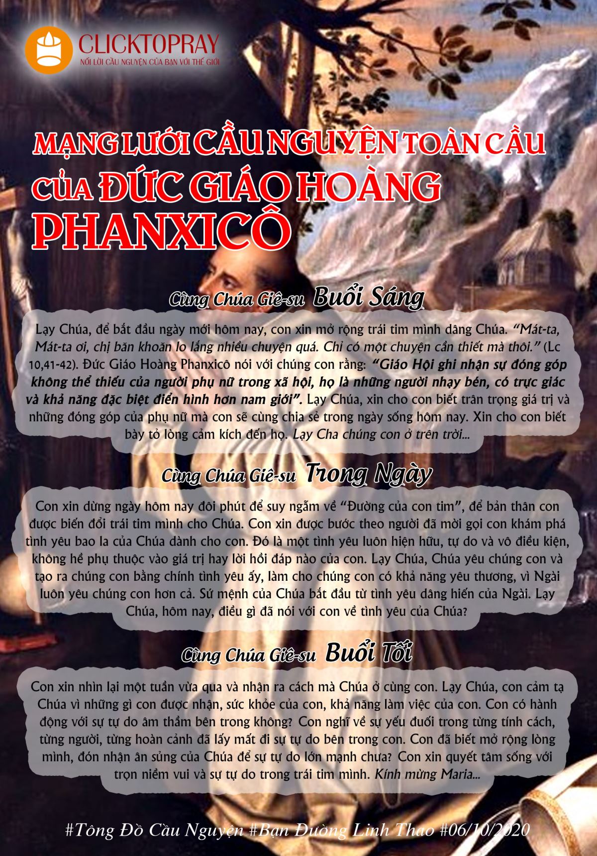 Lạy Chúa, để bắt đầu ngày mới hôm nay, con xin mở rộng trái tim mình dâng Chúa. “Mát-ta, Mát-ta ơi, chị băn khoăn lo lắng nhiều chuyện quá. Chỉ có một chuyện cần thiết mà thôi.” (Lc 10,41-42). Đức Giáo Hoàng Phanxicô nói với chúng con rằng: “Giáo Hội ghi nhận sự đóng góp không thể thiếu của người phụ nữ trong xã hội, họ là những người nhạy bén, có trực giác và khả năng đặc biệt điển hình hơn nam giới”. Lạy Chúa, xin cho con biết trân trọng giá trị và những đóng góp của phụ nữ mà con sẽ cùng chia sẻ trong ngày sống hôm nay. Xin cho con biết bày tỏ lòng cảm kích đến họ. Lạy Cha chúng con ở trên trời…