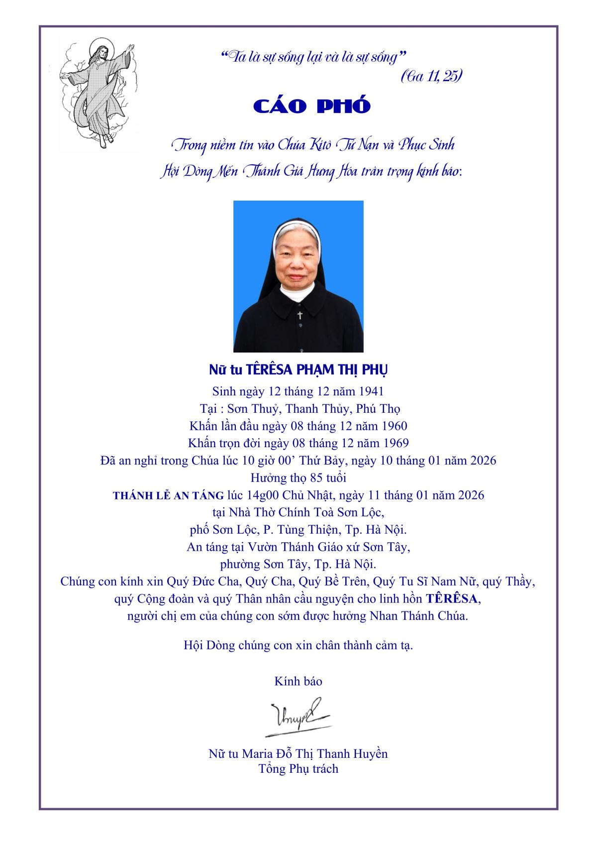 Cáo Phó: Nữ Tu Têrêsa Phạm Thị Phụ - Hội Dòng Mến Thánh Giá Hưng Hóa