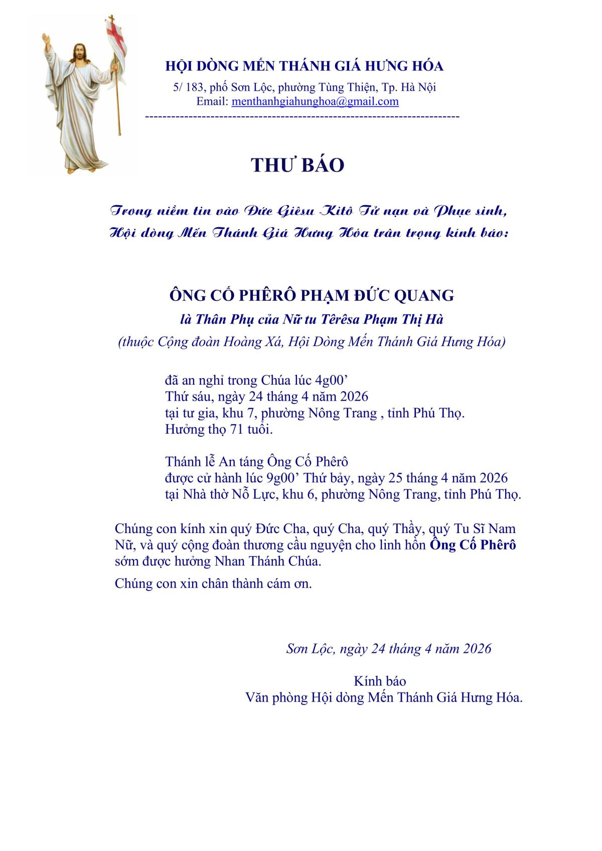 Cáo Phó: Ông cố Phêrô Phạm Đức Quang | Thân phụ Nữ tu Têrêsa Phạm Thị Hà (thuộc cộng đoàn Hoàng Xá) - Hội dòng Mến Thánh Giá Hưng Hóa